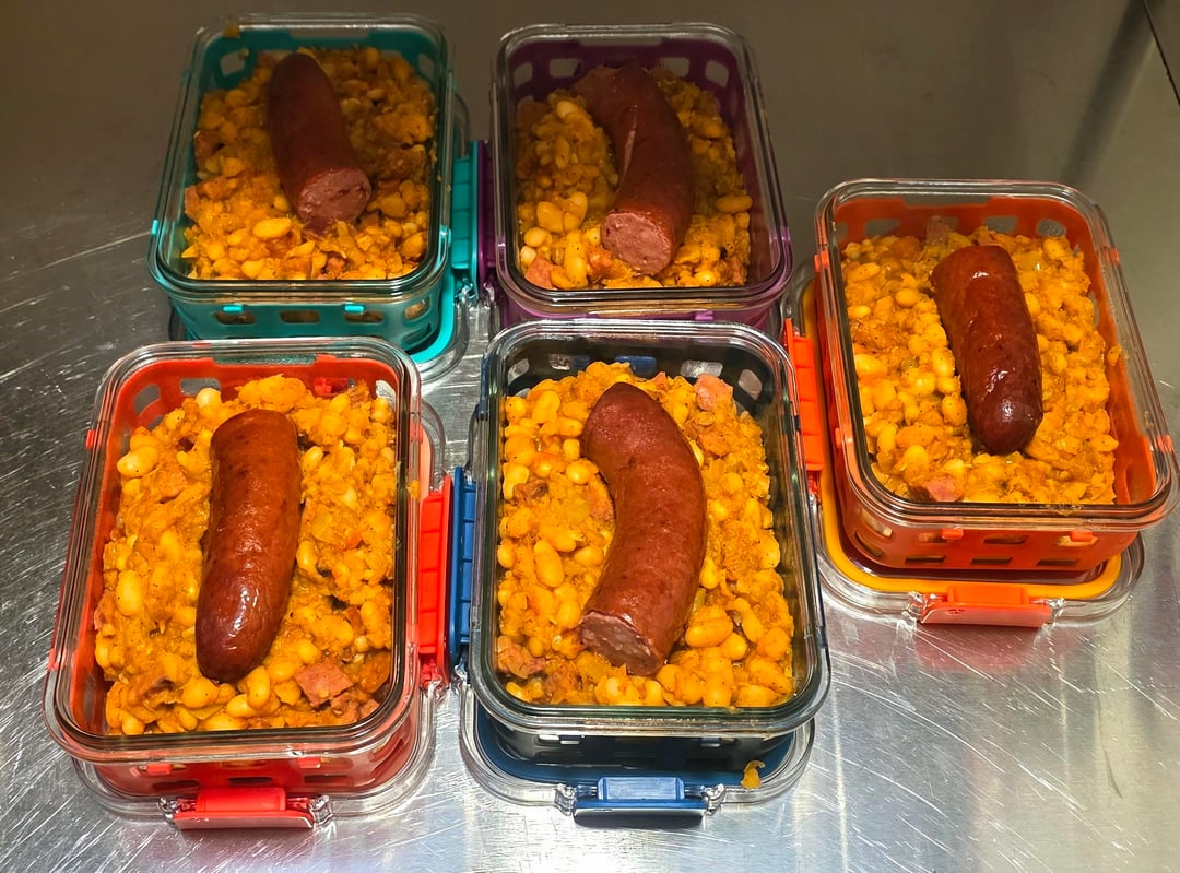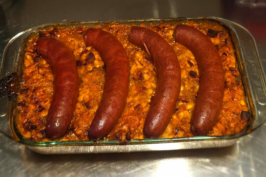 Eine Stunde lang bei 200 °C backen. Nehmen Sie die restlichen ganzen Würste heraus, geben Sie sie obendrauf, drücken Sie sie nach unten in die Bohnenform und backen Sie sie eine weitere halbe Stunde lang.
