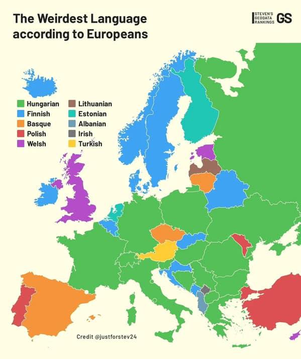 this map has been posted 20342348 times already and we are in consensus that all of this „data“ is contrived. yes, kosovars absolutely do think that irish is the weirdest language. i heard that in pristina while chugging gallons of guinness with my kosovar buddies. if the number of turks who can imitate the polish language is over a hundred thousand, i’m gonna apply for guatemalan citizenship. when distant languages like chinese exist, i am fully sure that most of europe thinks hungarian is the weirdest language.
