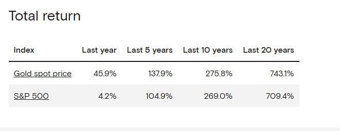 Tale razpored zgoraj je malo zavajajoč. Če je zlato v zadnjem letu zraslo za skoraj 50%, potem so ostali procenti zelo podrejeni temu, saj je trenutna cena osnova, ne primerjava sproti po časovnici. Gre še vedno za špekulacijo, če danes kupiš in jutri pade za 10%, imaš problem.