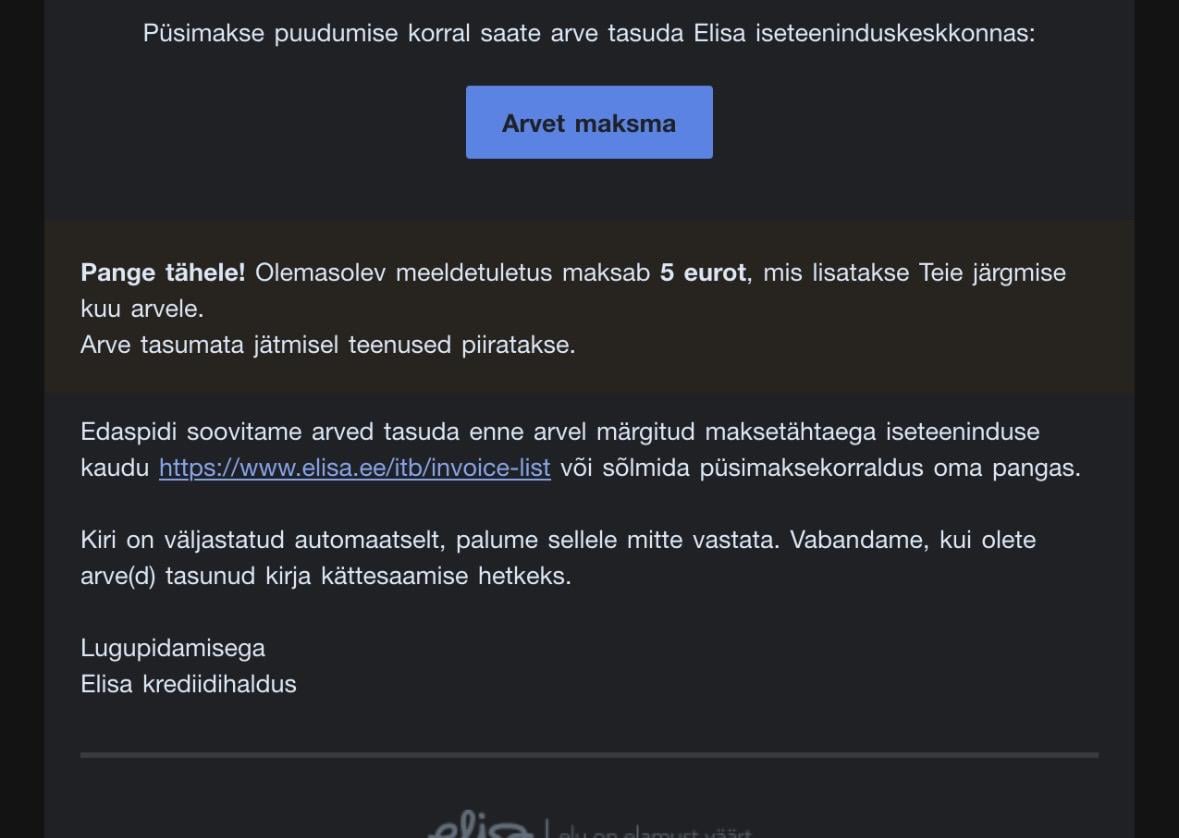 Es stellt sich heraus, dass Elisa irgendwann eine solche Rechnungsstellungsrichtlinie hat, dass, wenn Sie vergessen, die Rechnung rechtzeitig zu bezahlen, eine Erinnerung an Ihre E-Mail gesendet wird, die 5 Euro kostet.