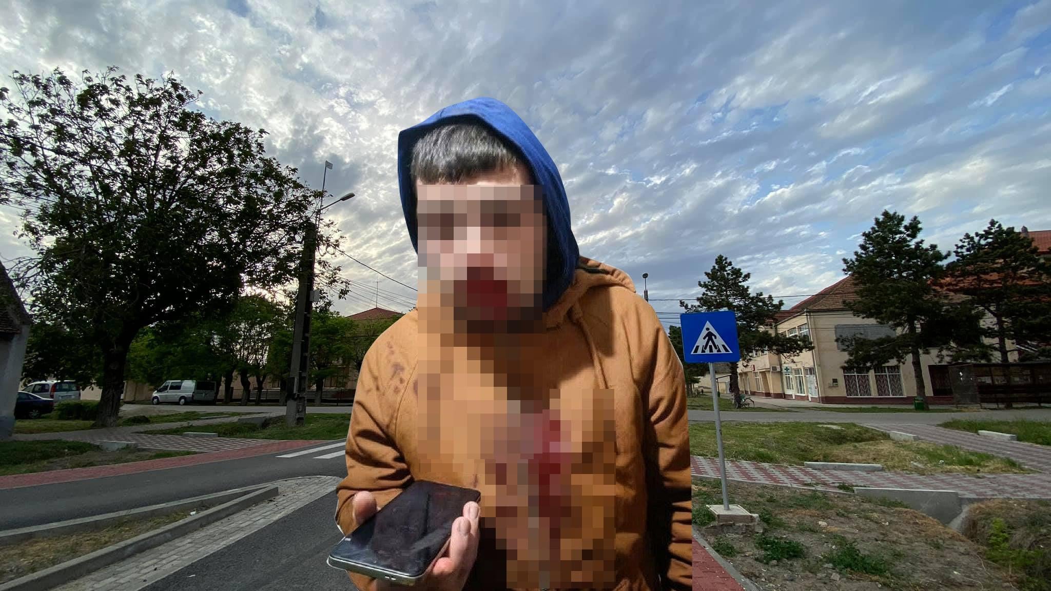 Junger Mann, der von Teenagern entstellt wurde, die wegen Mordes an Mario Berinde verhaftet wurden. Das Opfer zog seine Anzeige fünf Tage vor der Tat der Angreifer in Cenei zurück: „Einer der Eltern der Kriminellen rief ihn auf die Wache.“
