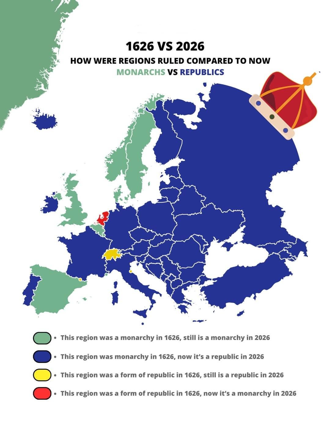 Spain should be it’s own category: „Was a monarchy in 1626, and is a monarchy AGAIN in 2026.“