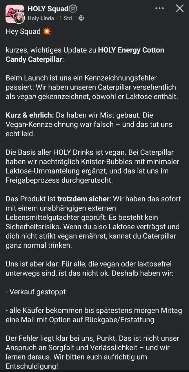 Hier wurde ja vor einigen Tagen von Holy Energy Cotton Candy Caterpillar gesprochen, weil dort Laktose enthalten war trotz Vegan Kennzeichnung.