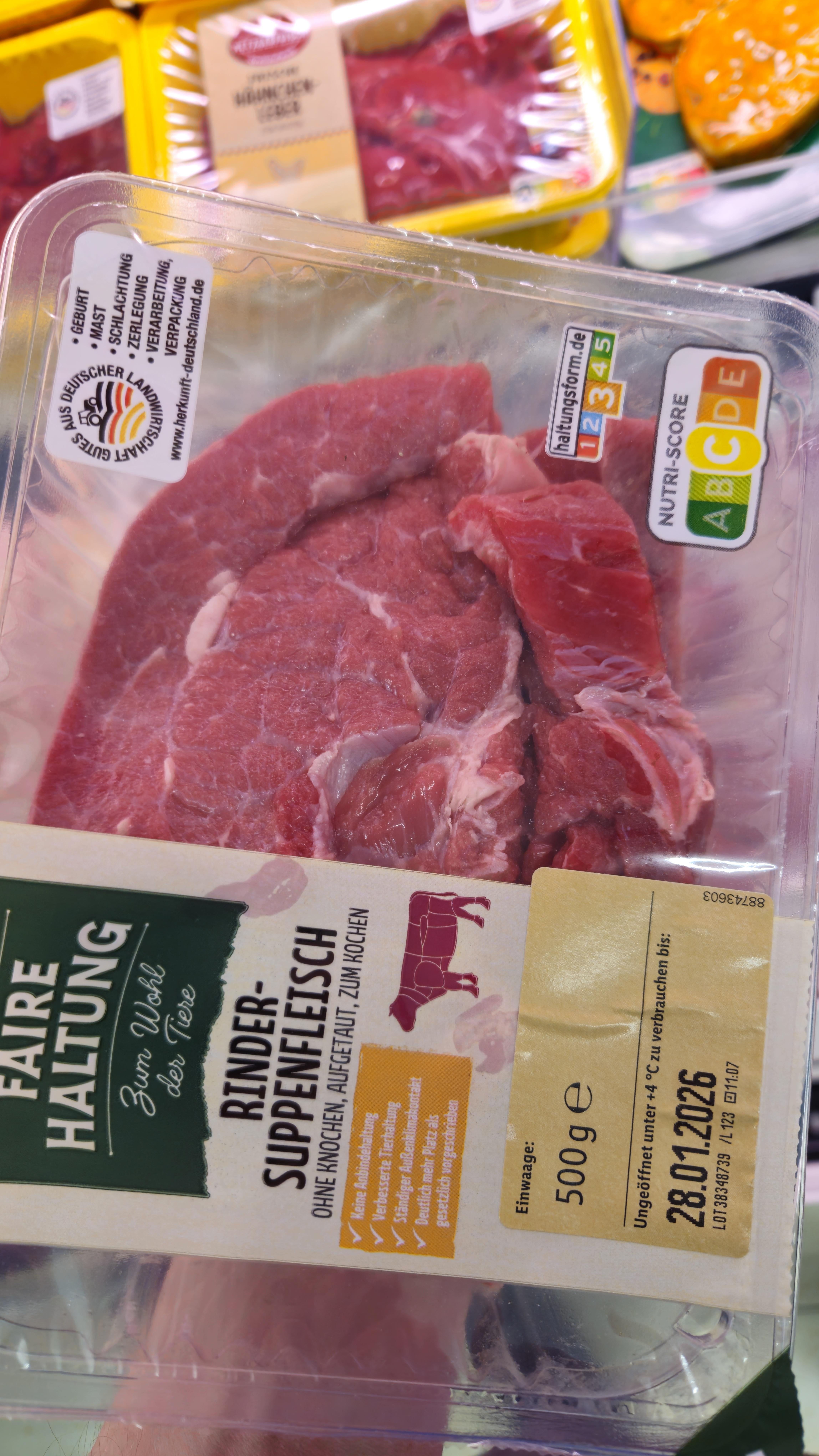 Suppenfleisch schneidest du normalerweise aus der hesse, Nacken, Wade oder querrippe.