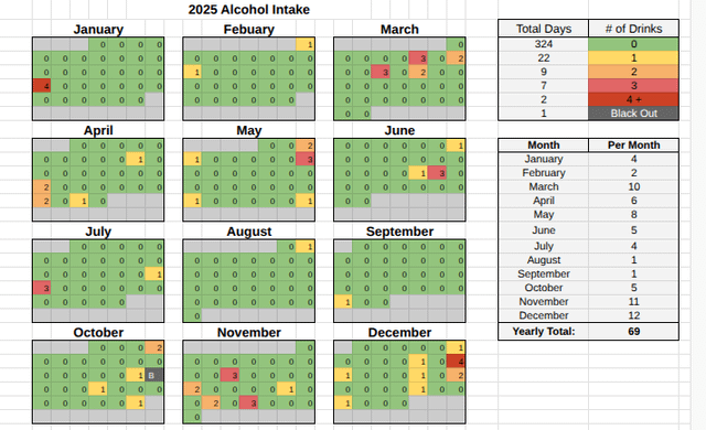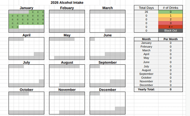 Nothing to track this year so far, first successful dry January attempt. No drinking problem or anything, just always some event that helps me not get there, I think tracking my consumption just helps you be more in touch with what you are actually doing , rather than your perception of how it’s going…