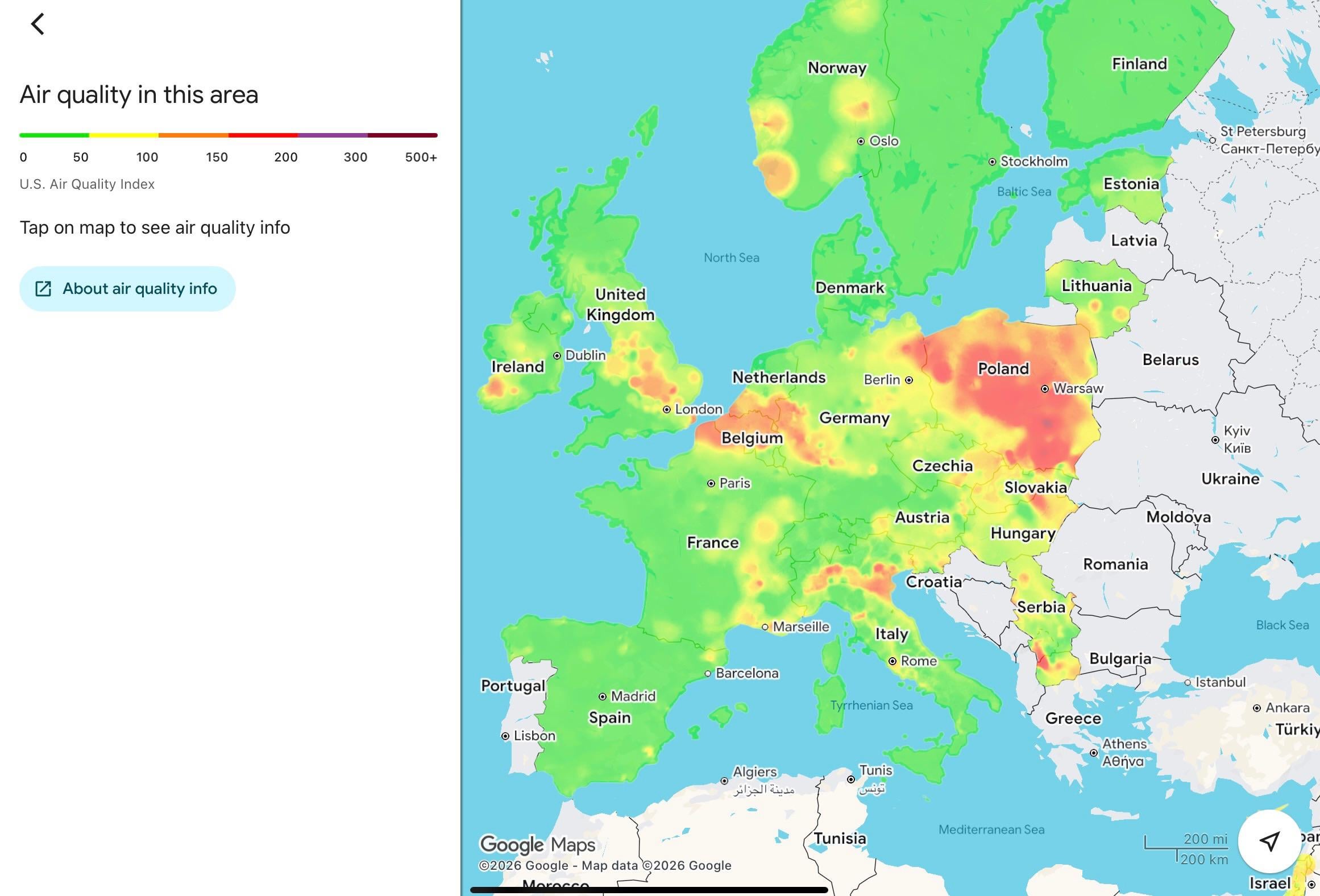 Ich habe mir die Google-Karte angesehen und war überrascht, wie schlecht die Luftqualität in Belgien ist. Kann mir jemand erklären, was die Ursache dafür ist? Gibt es einen Waldbrand??? Ist es im Winter immer so schlimm??