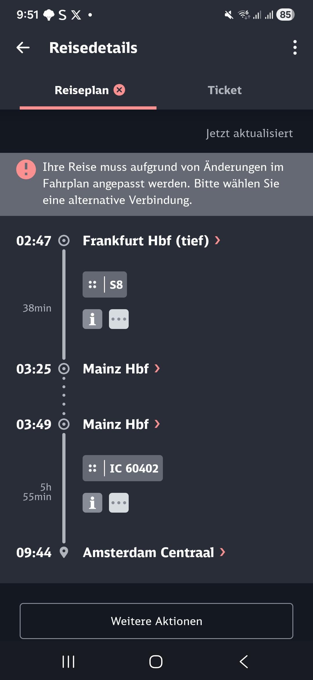 Okay, ich habe diese Reise im Februar (die nicht storniert werden kann) und seit den neuen Jahren sind mir einige Probleme mit diesem Zug aufgefallen, den ich gekauft habe. Sie ändern viele Dinge, ich habe letzte Woche sogar mit meinem Freund nachgefragt und der erste Zug sollte nicht einmal in eine bestimmte Stadt fahren, in die ich eine Verbindung herstellen müsste. Heute habe ich noch einmal in der App nachgesehen und dies ist aufgetaucht. Ich habe mit meinem Freund gesprochen und eine kleine Google-Recherche durchgeführt. Auf meinem Ticket steht, dass ich eine andere Alternative wählen kann, um an mein Ziel zu gelangen. Ich möchte wissen, wie es genau funktioniert, ich bin nicht von hier, also macht mich diese ganze Situation etwas nervös – am Tag der Reise wähle ich eine andere Alternative in der App aus oder steige einfach in einen ICE ein und zeige mein Ticket (das alte, sie geben mir nicht die Möglichkeit, mein Geld zurückzuerhalten) – wo sollte bei dieser ersten Option eine andere Alternative erscheinen?