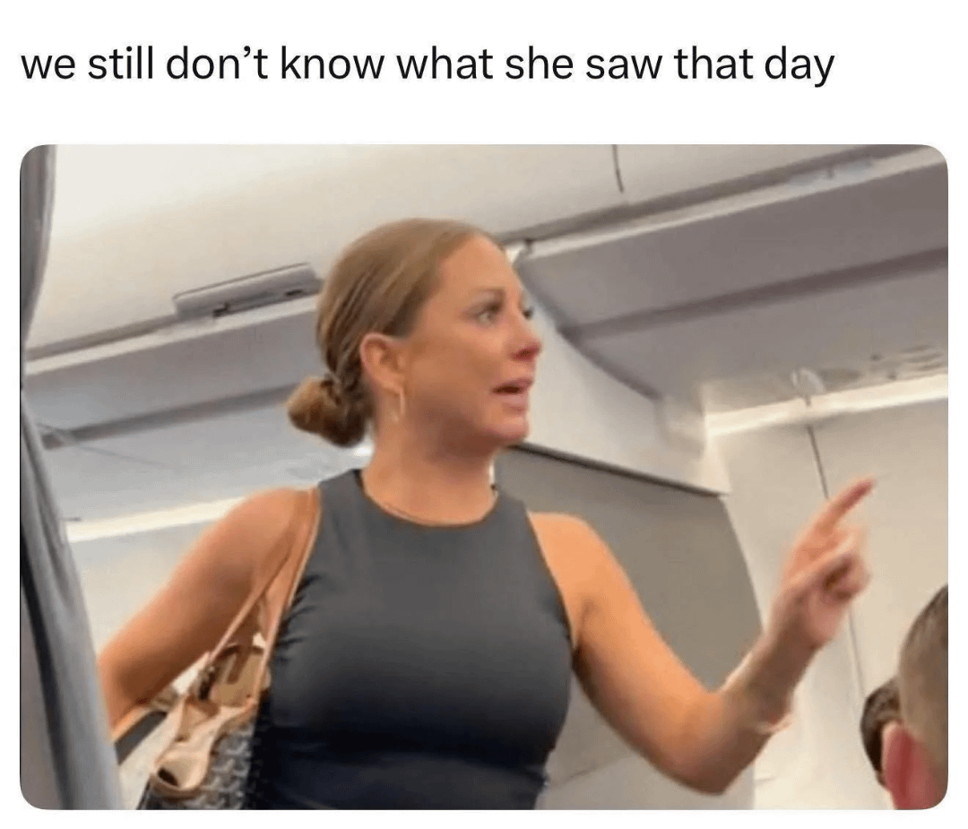 We do know what she saw – nothing. Go watch her interviews about it, she basically says she was getting in an argument with another passenger after giving up her seat, and said „this motherfuckers not real“ in sense of “ I can’t believe this person“ – not that she was seeing demons or ghosts. There a longer video that shows expands on this more than the version that went viral.