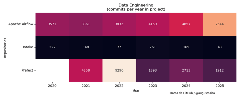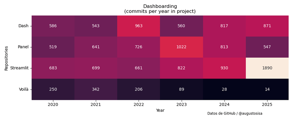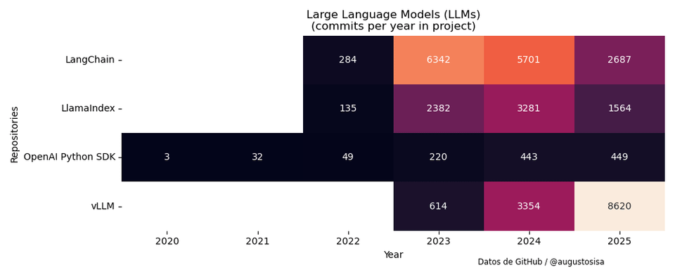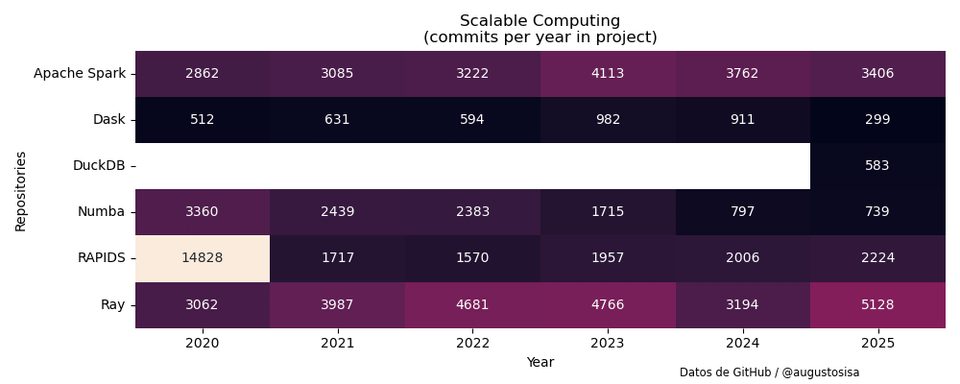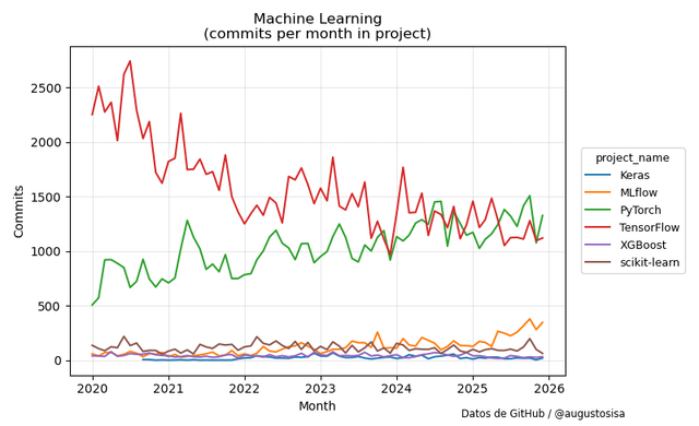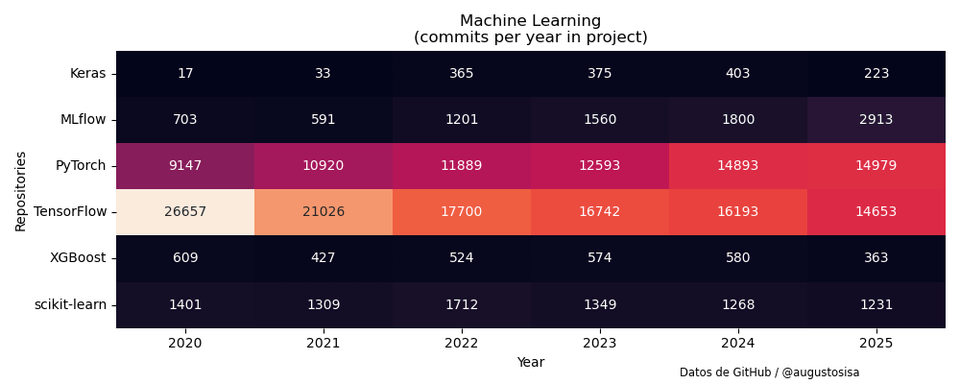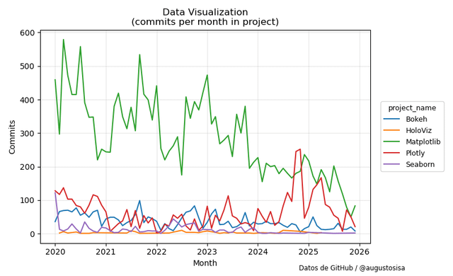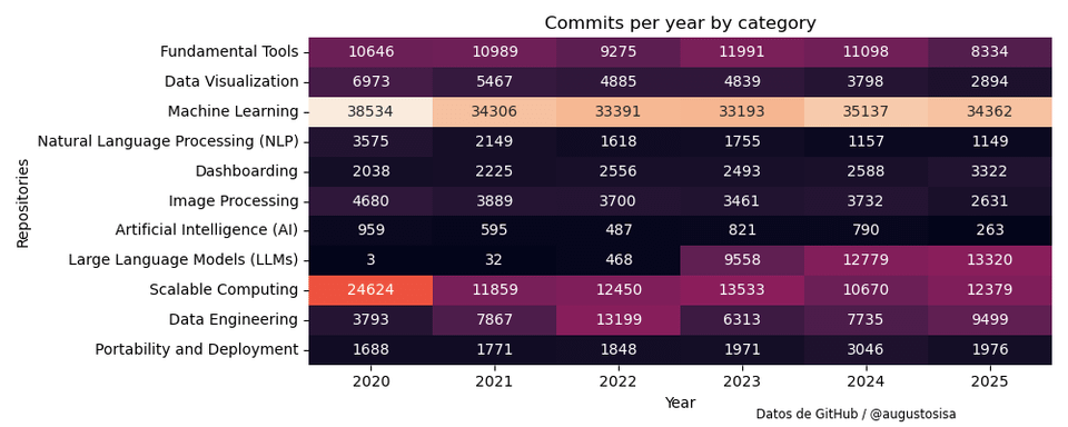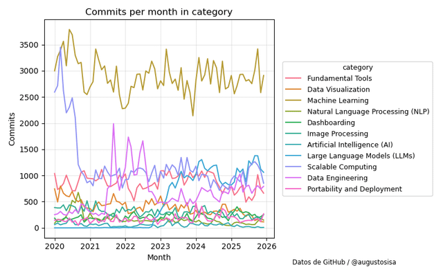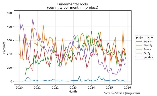 Vor einigen Tagen veröffentlichte Anaconda Inc. in X eine Liste von 48 Open-Source-Python-Bibliotheken und Tools für Datenanalyse, maschinelles Lernen und künstliche Intelligenz. Um die Entwicklungsaktivitäten in diesen Projekten zu untersuchen, habe ich Daten zur Anzahl der GitHub-Commits von 2020 bis 2025 gesammelt und die folgenden Ergebnisse zusammengestellt.