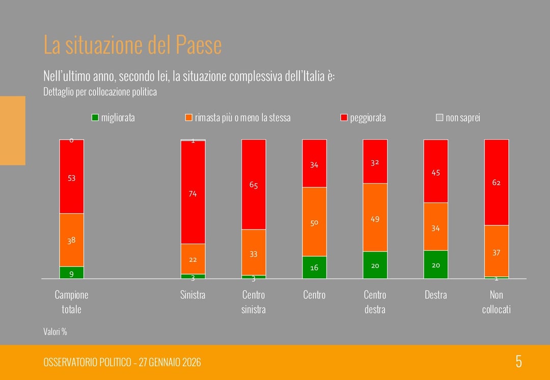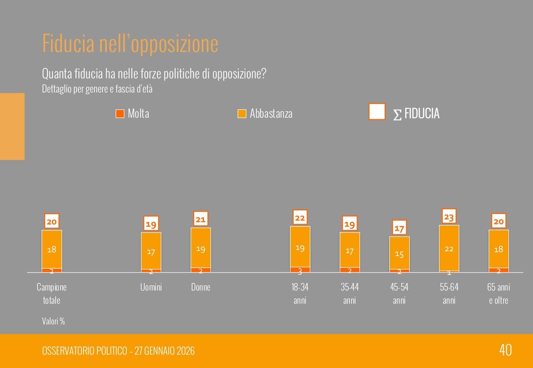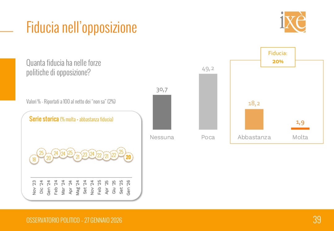 Triste invece constatare che la fiducia rimane pressoché invariata mentre le persone ritengono che le condizioni del Paese siano peggiorate. Stendiamo un velo pietoso sull’opposizione.