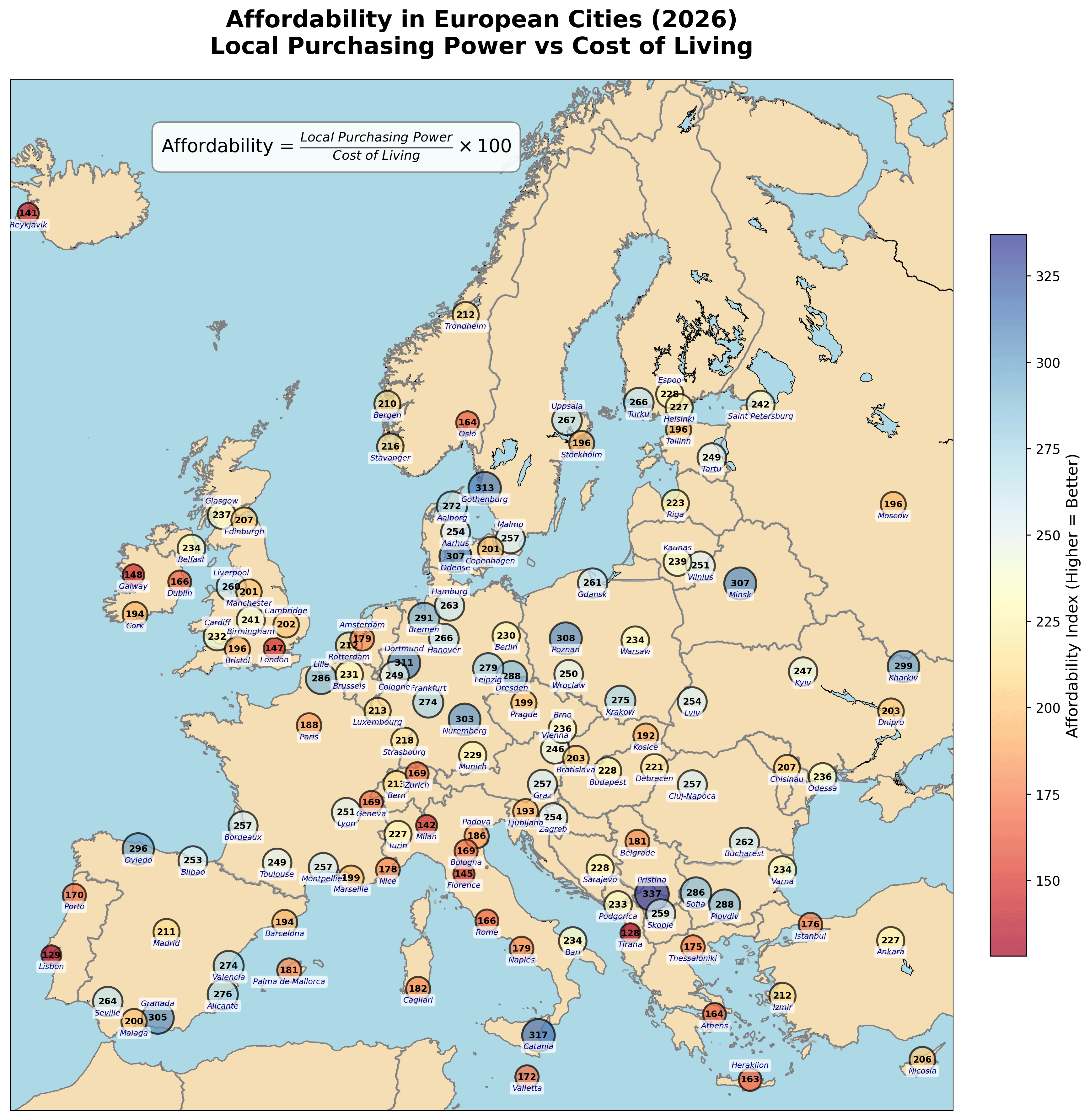 Niedrigere Werte (rötliche Farben) weisen auf weniger erschwingliche Städte hin, höhere Werte (bläuliche Farben) auf erschwinglichere Städte mit dem durchschnittlichen lokalen Einkommen.