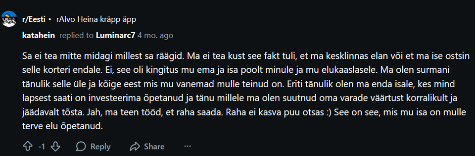 2. See lugu on päris imelik jah. Kass on tervelt 8 aastat temaga elanud ja talle nii armas, aga ravi jaoks raha ei jätku. Samas muidu on uljalt jaganud, kuidas ta on nii rahatark, jõukas jpm. Ma ei tea, ma pole oma eluga kunagi Raivo Heina võsukese tasemel olnud, aga oma loomade jaoks oleme oma perega alati kasvõi iseenda arvelt kõik teinud. Teeksin seda ka nüüd, kui muud üle ei jääks. Ja kui peaks olema hüpoteetiliselt olukord, kus on oma rahaasjad täiesti pekkis, siis ma igal juhul küsiks ka perelt abi, isegi kui nende rahakott on Raivo Heina omast kaugel. Sest loom on pereliige ja tema elu on vaid üks ajaetapp sinu elust, kuid talle oled sa terve elu. Minu südamesse see asi ei mahu. Allergia ravi ei tohiks nüüd nii kulukas ka olla, kuigi jah, ma ei tea detaile.