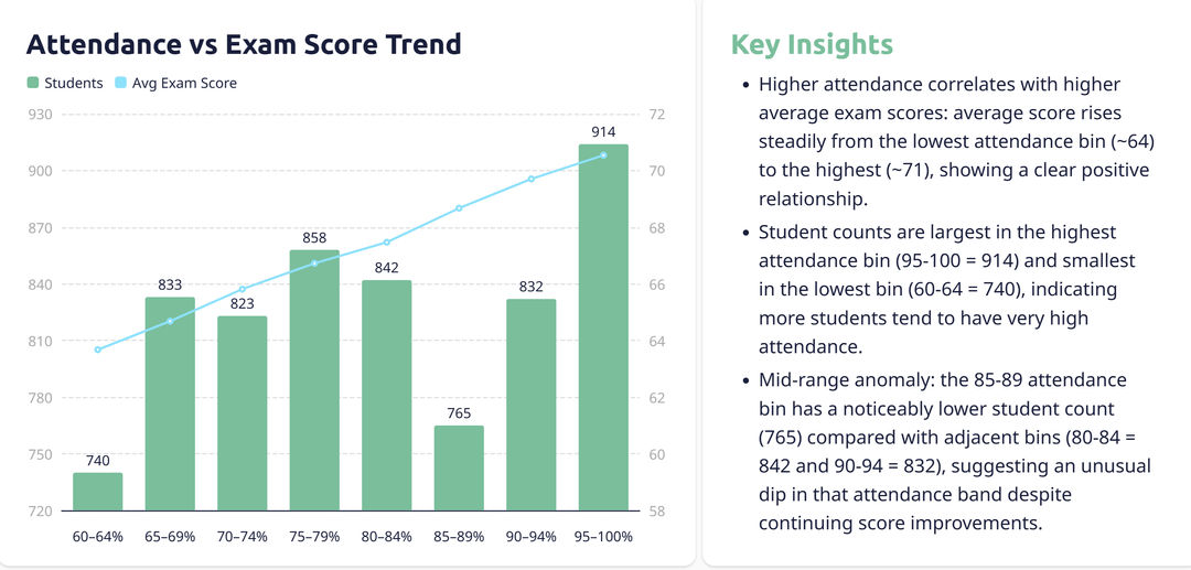 - Die Prüfungsergebnisse steigen mit der Anwesenheit, von etwa 64 in der niedrigsten Anwesenheitsgruppe auf etwa 71 in der höchsten Anwesenheitsgruppe, wobei sich die meisten Studenten in der höchsten Anwesenheitsgruppe befinden und eine Gruppe kleiner als erwartet im Bereich von 85–89 % liegt.