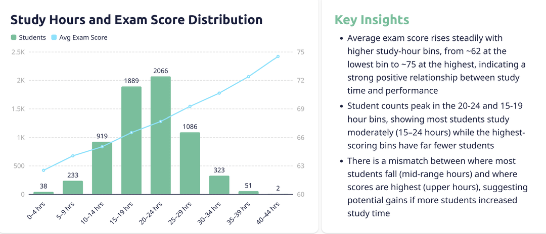 - Die Prüfungsergebnisse steigen mit der Studienzeit, aber die meisten Studenten werden im mittleren Bereich der Studienstunden eingeteilt, nicht dort, wo die höchsten Ergebnisse erzielt werden