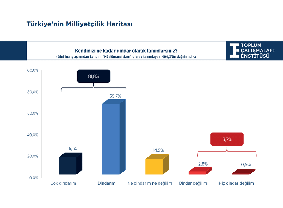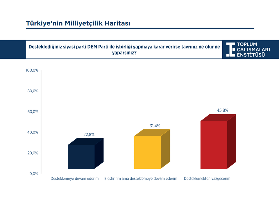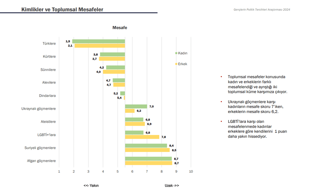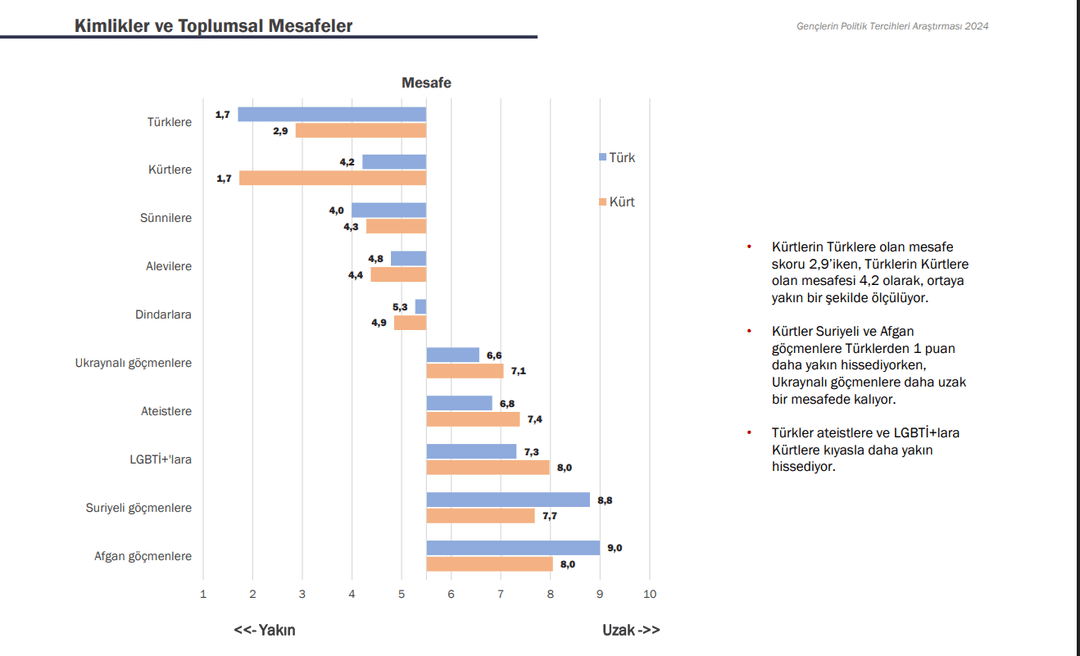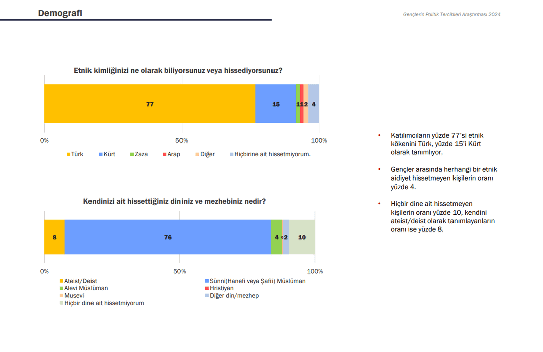 2- Die nächste Umfrage wurde unter jungen Menschen im Alter zwischen 18 und 30 Jahren in Zusammenarbeit mit GoFor und KONDA durchgeführt. Während die Anteile derjenigen, die sich als Atatürkisten und Sozialisten bezeichnen, mit 44 % bzw. 11 % steigen, ist der Rückgang bei den Konservativen, Islamisten und Sozialdemokraten spürbar. Der Umfrage zufolge bezeichnen sich 77 % der Jugendlichen als Türken und 15 % als Kurden. Die Umfrage ergab auch, dass sich Kurden den Türken näher fühlen als die Türken den Kurden.