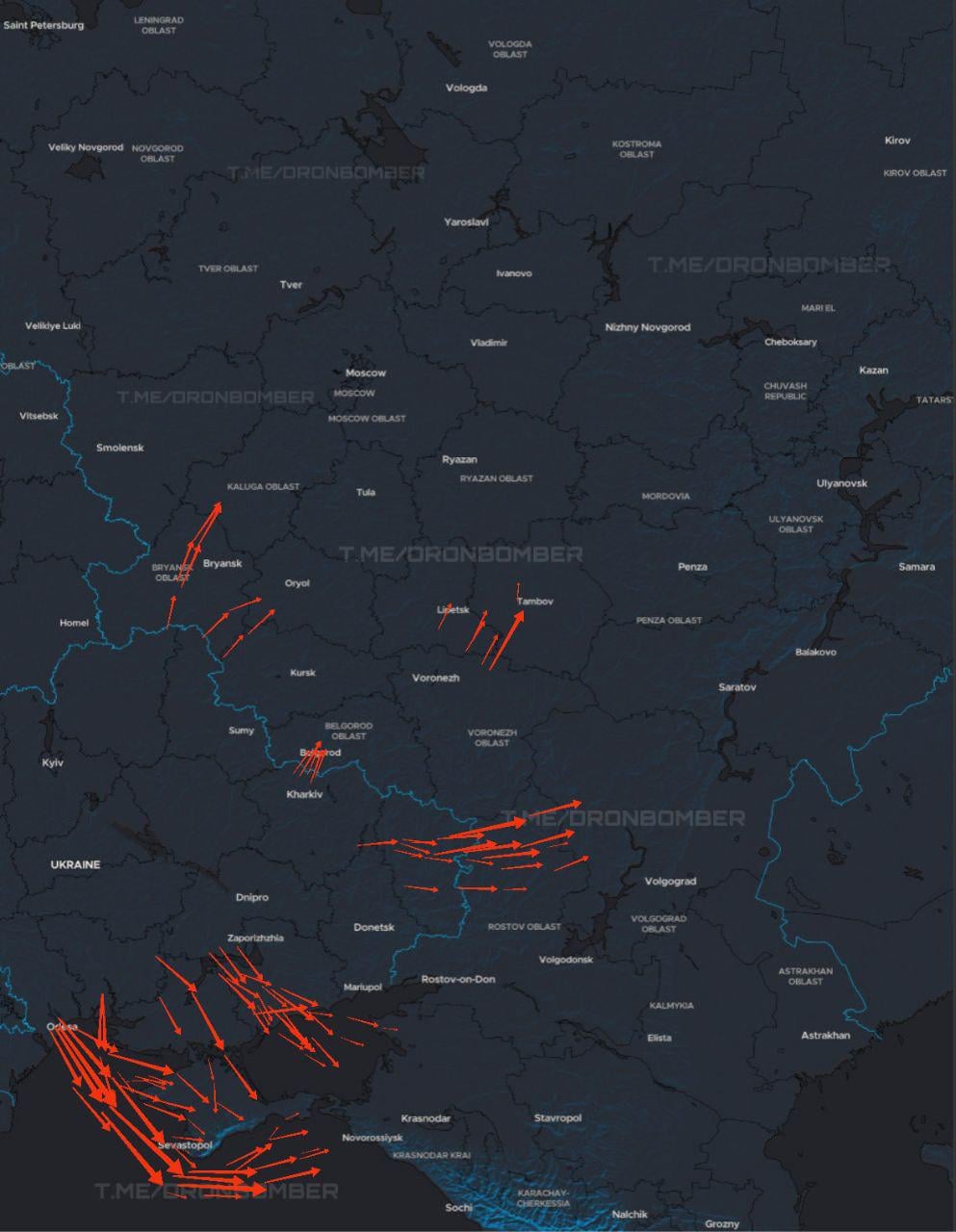 Ungefähre Flugrouten ukrainischer Drohnen, die heute Abend russische Ziele angreifen https://i.redd.it/jz2sfbt0iyfg1.jpeg