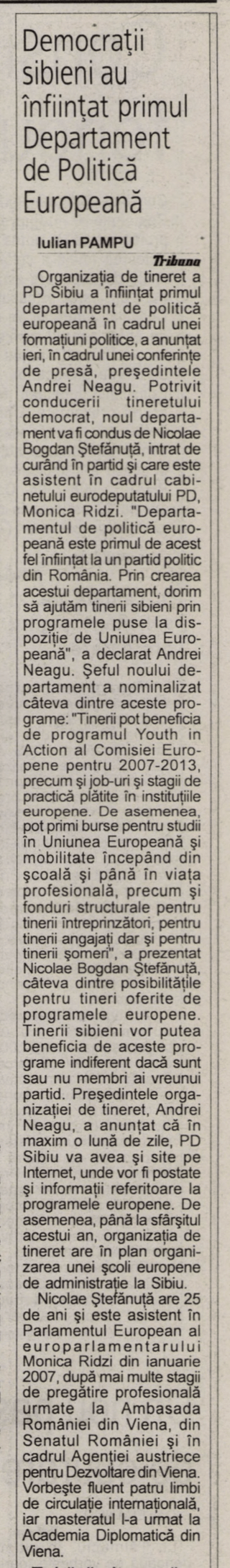 Nach Angaben der Führung der demokratischen Jugend wird die neue Abteilung von Nicolae Bogdan Ştefănuţă geleitet, bin kürzlich der Partei beigetreten und der Assistent im Kabinett des PD-Europaabgeordneten ist, Monica Ridzi.