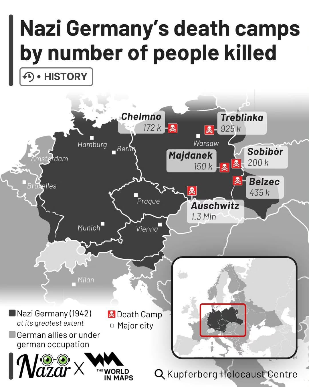 The Nazis murdered around six million Jews in total, and many of them were killed beyond the death camps shown here. They also targeted Roma people, disabled individuals, political prisoners, Slavs, LGBTQ+ people, and others they considered “undesirable.” The death camps were just one part of a much larger system of genocide.