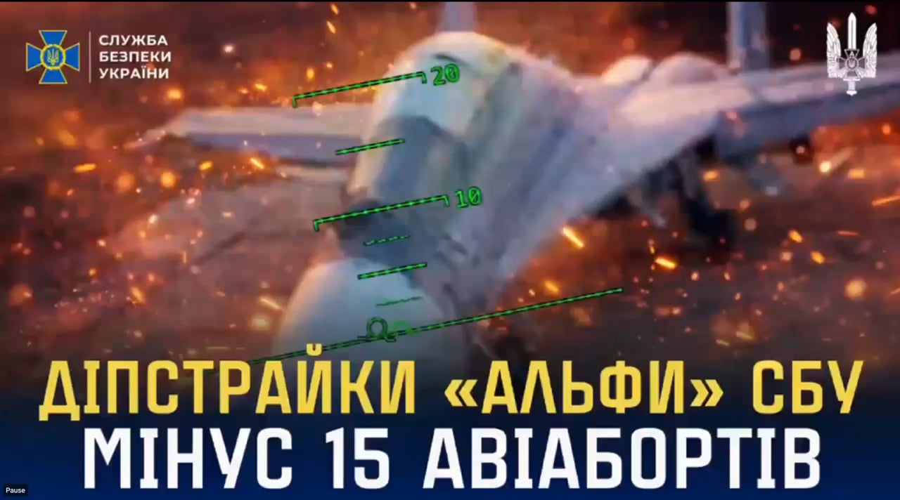 Der Sicherheitsdienst der Ukraine führte weitreichende Drohnenangriffe auf fünf russische Militärflugplätze tief im Hinterland durch. Im Visier sind 15 Flugzeuge: 11 Jäger und Bomber (Su-30SM, Su-34, Su-27, Su-24, MiG-31), drei Hubschrauber (Mi-28, Mi-26, Mi-8) und ein Transportflugzeug (An-26).