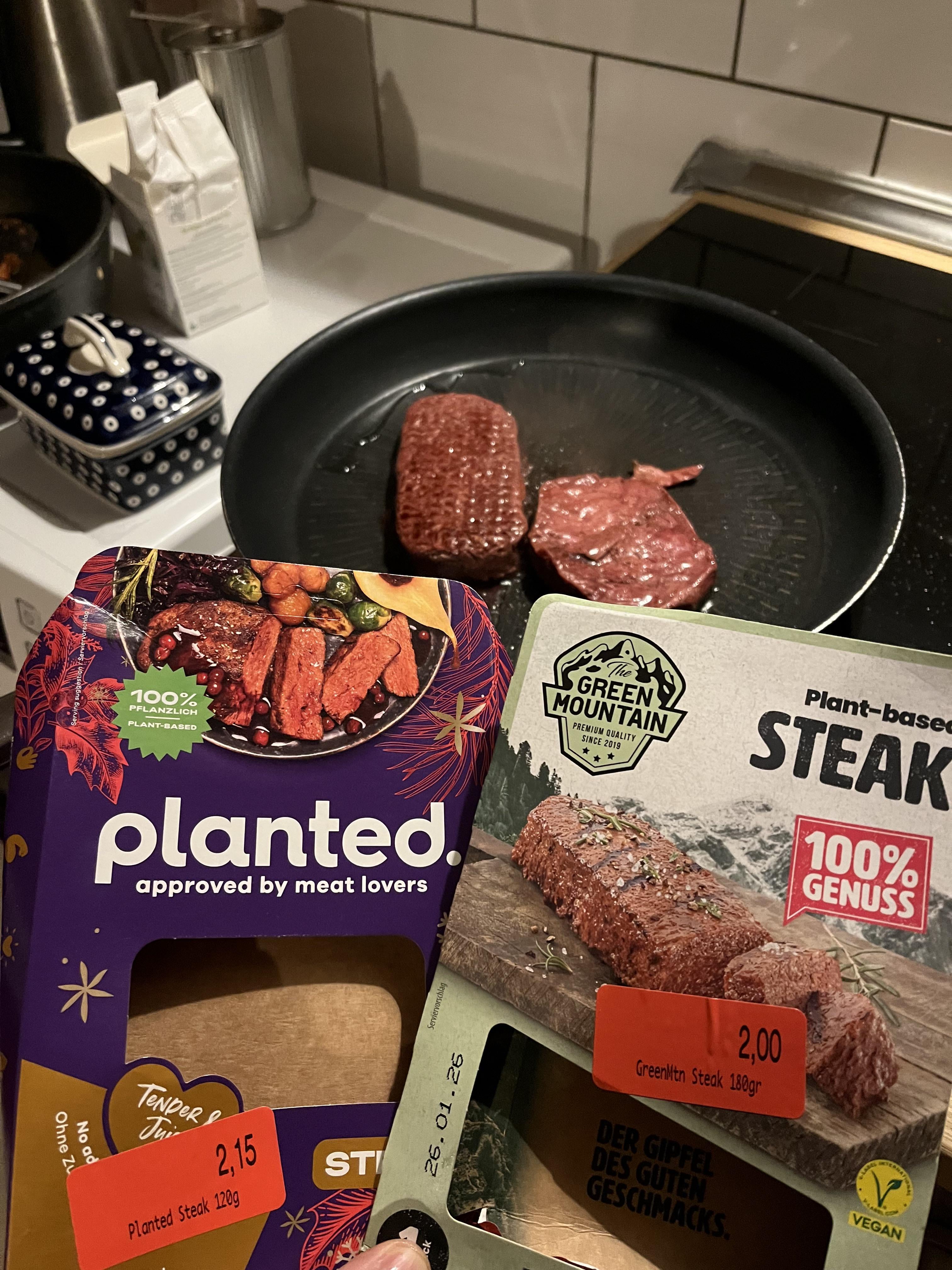Planted ist wirklich krass. Kann die neuen Würfel (also wie Gulasch) empfehlen, da ist mehr drin, kostet weniger als das Steak und sind halt einfach die Steaks kleingeschnitten.