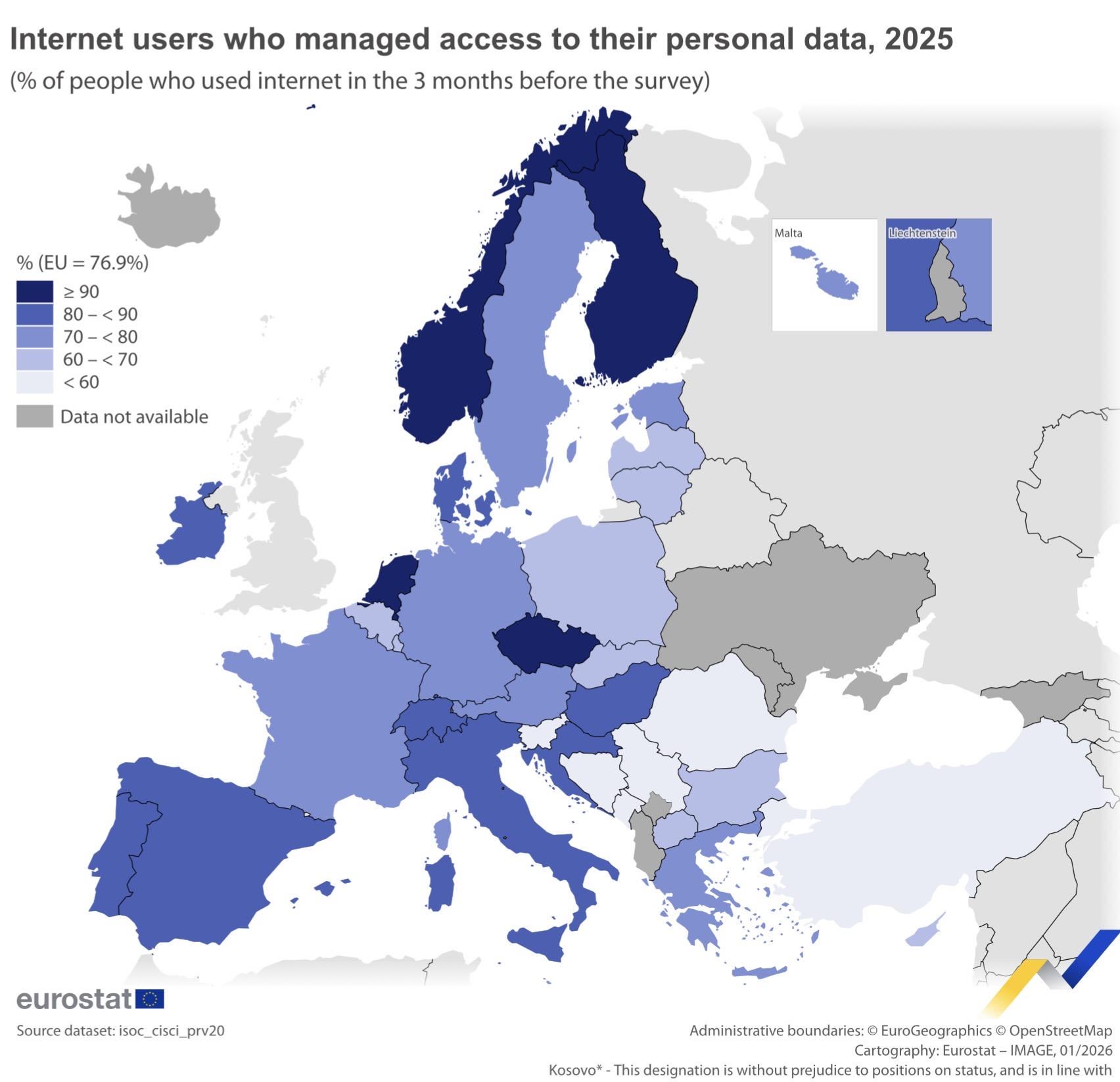 Den höchsten Anteil an Internetnutzern, die Maßnahmen zum Schutz ihrer Daten ergriffen haben, verzeichnete Finnland (92,6 %), gefolgt von den Niederlanden (91,2 %) und Tschechien (90,3 %). Im Gegensatz dazu wurden die niedrigsten Anteile in Rumänien (56,0 %), Slowenien (57,4 %) und Bulgarien (62,0 %) verzeichnet.