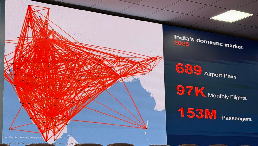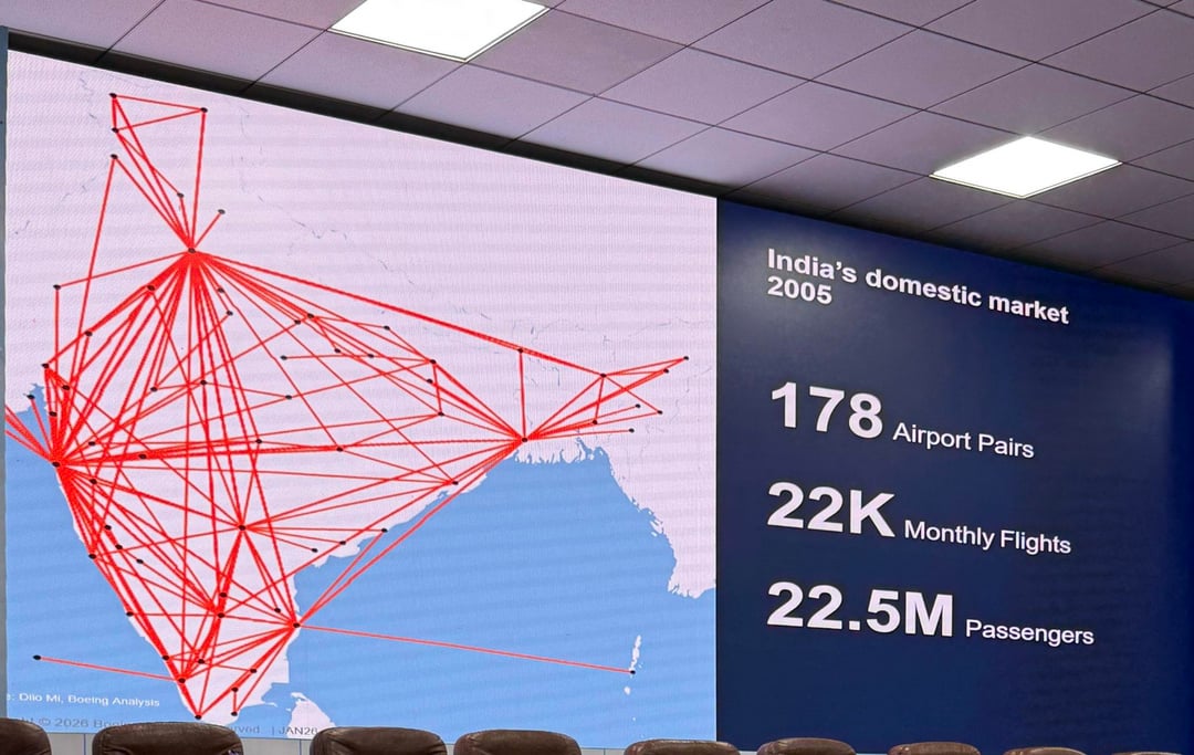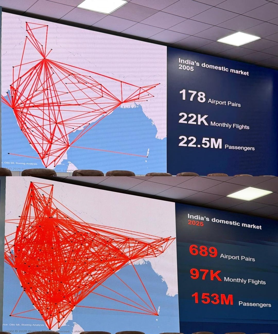 Indiens Inlandsflugnetz: 2005 vs. 2025. Mit freundlicher Genehmigung von Boeing.