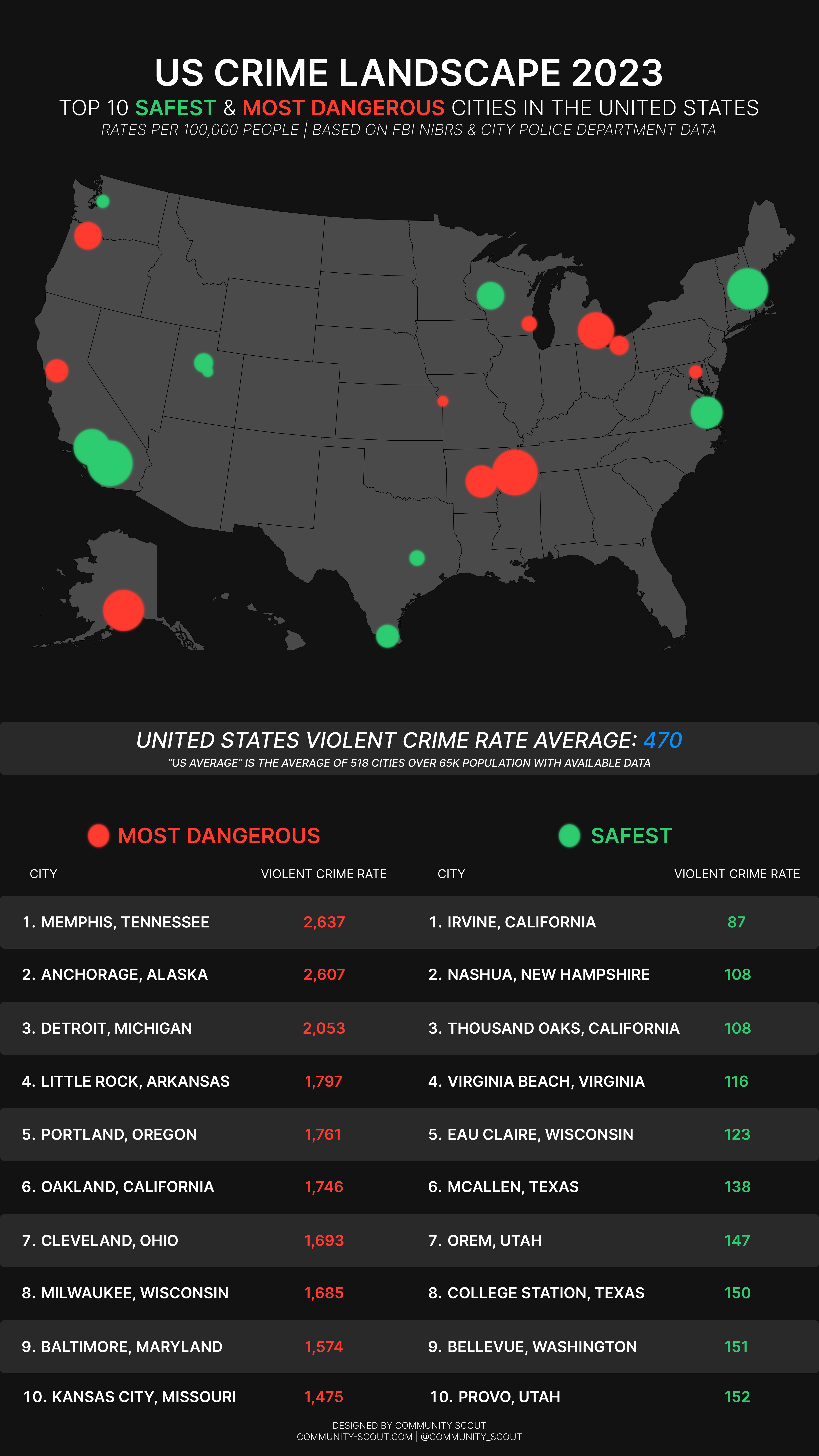 - Memphis, Tennessee (die gefährlichste Stadt) weist eine hohe Gewaltkriminalitätsrate auf 30-mal höher als Irvine, Kalifornien (die sicherste Stadt)