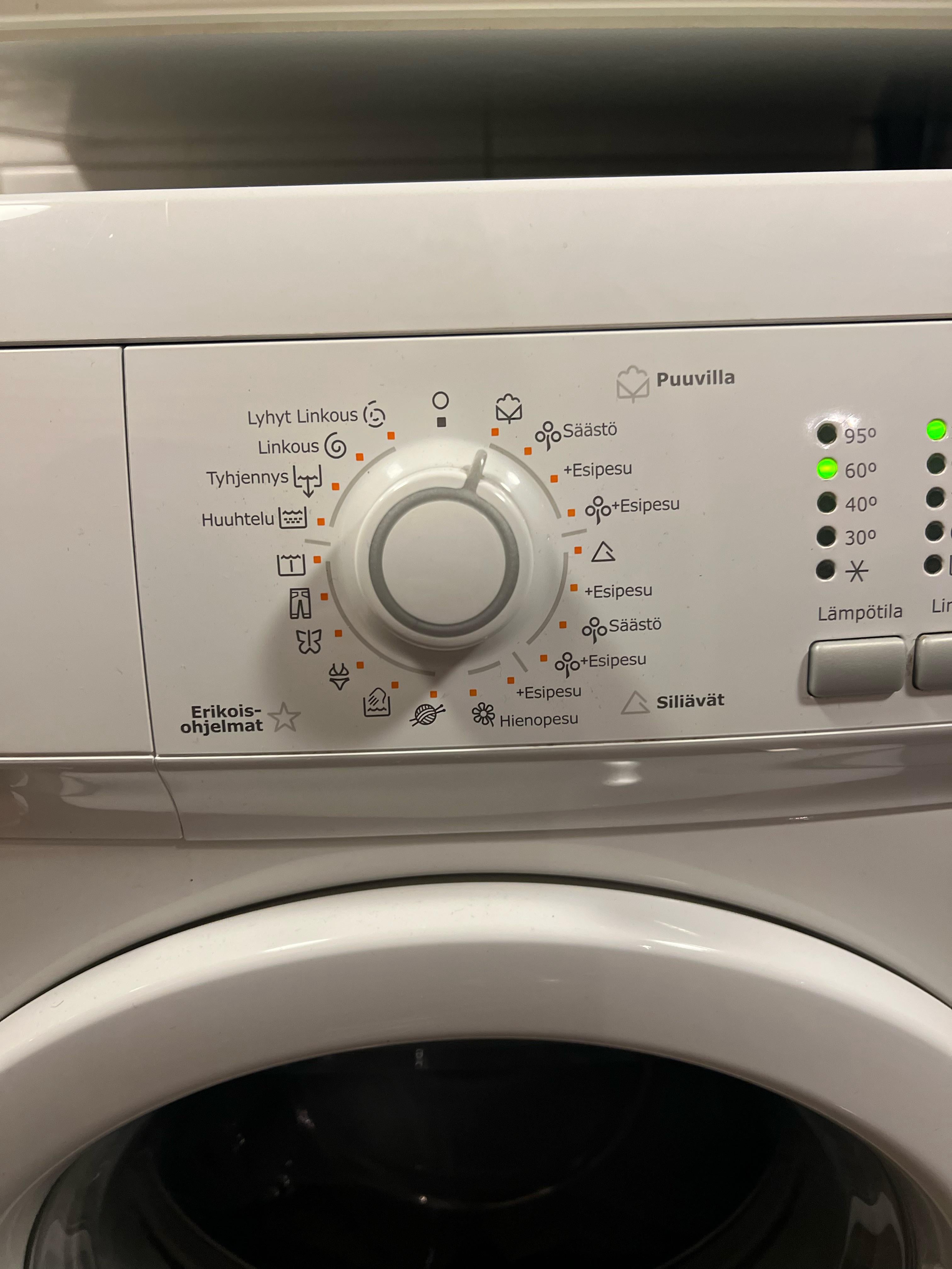 For general wash use the first one clockwise, that says cotton. For delicates, use the one labeled „hienopesu“. The one next to it is wool.