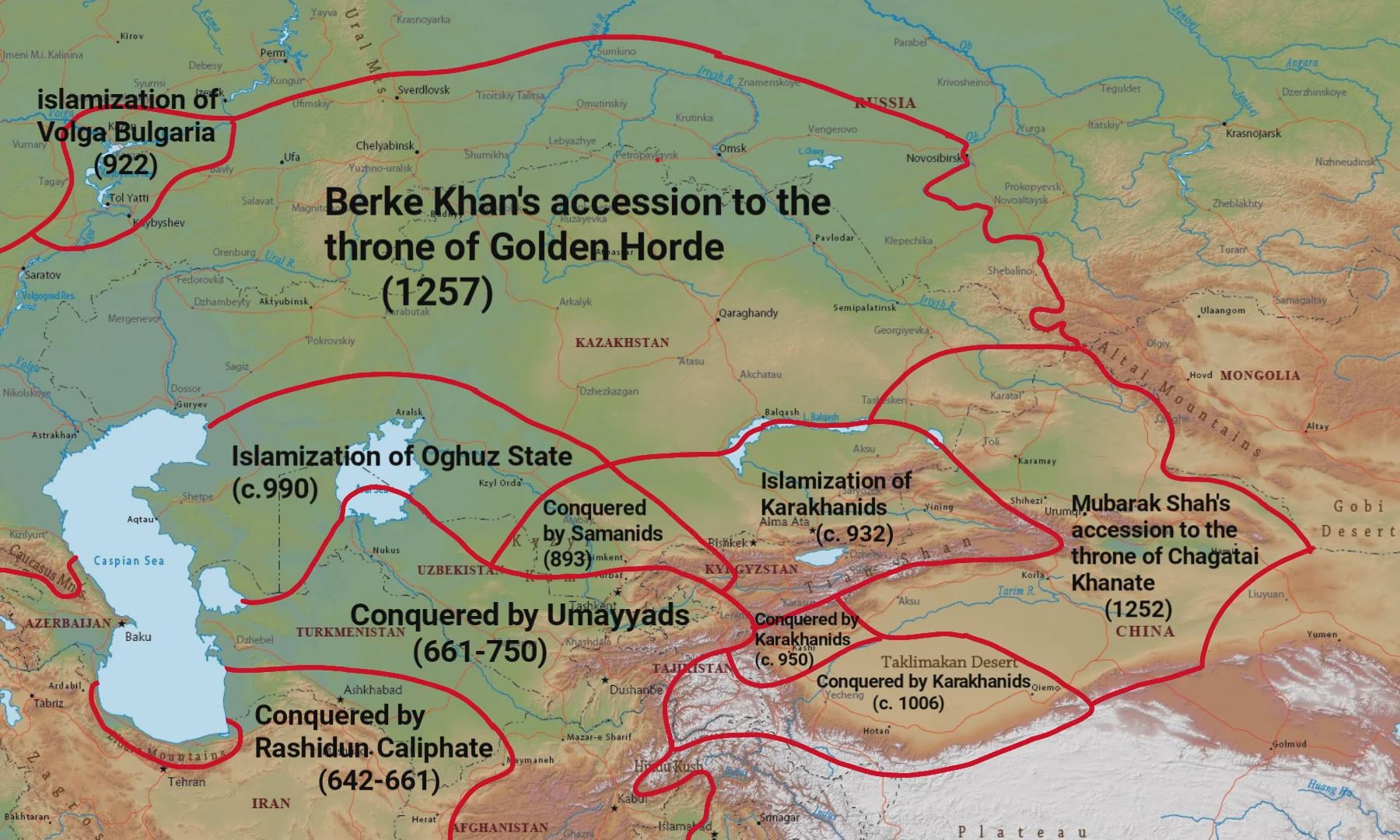 There weren’t any Turks in Transoxiana when it was conquered by Umayyads btw. The region has been Persian speaking and agrarian for most of history before the Seljuk conquest. A better map of the Medieval Turkic groups would be one that is centered on Kazakhstan with the Pontic Steppe, Ukraine and Romania in the West and Mongolia in the East