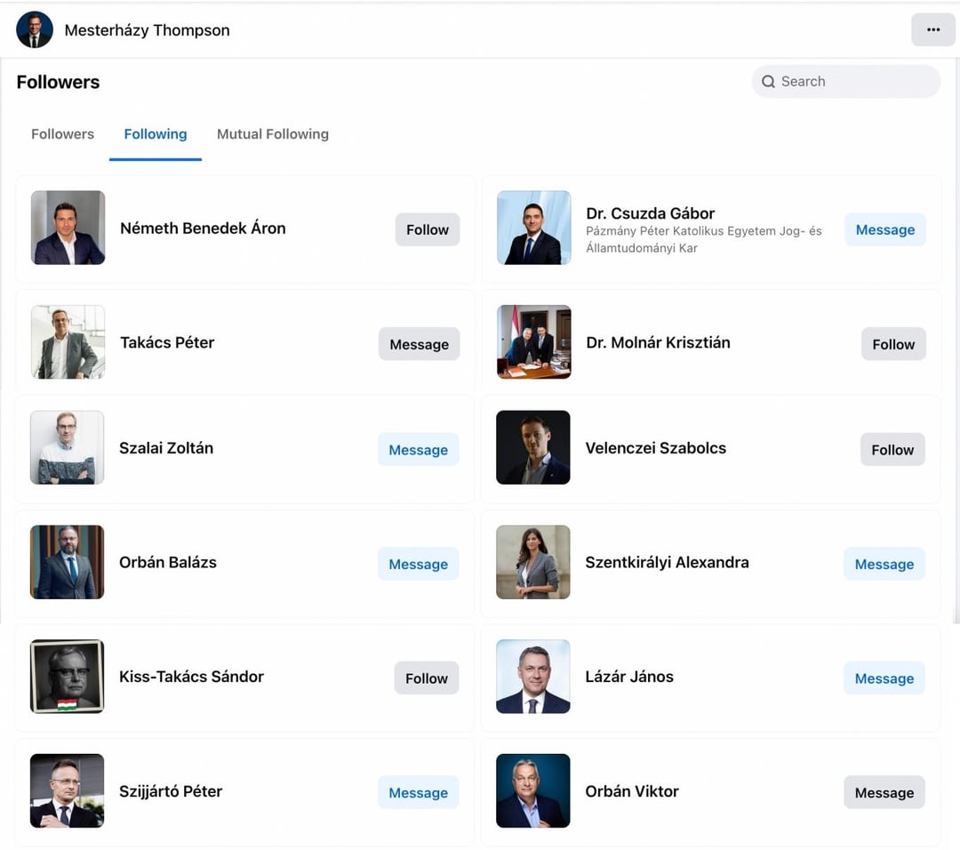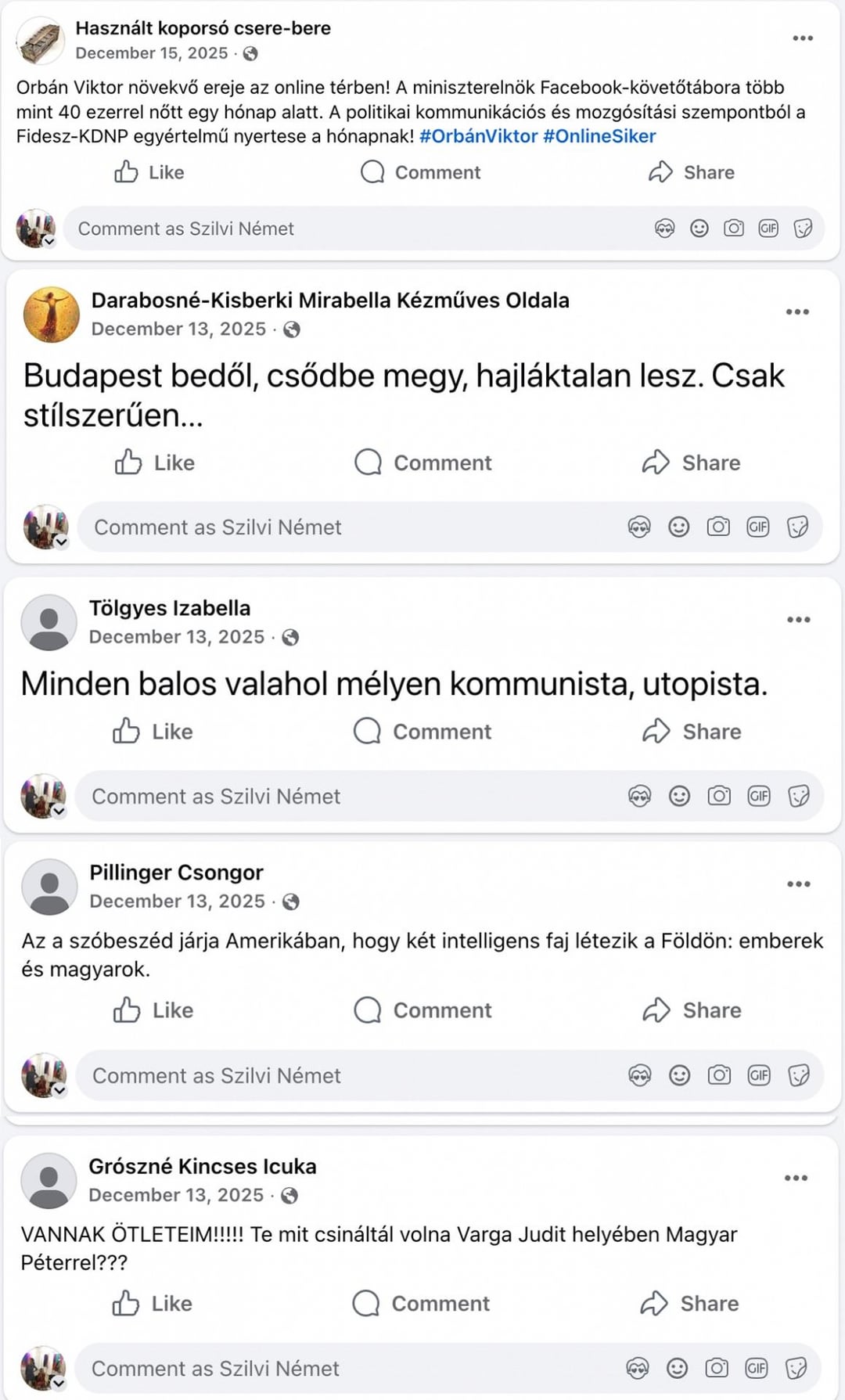 Das Troll-Netzwerk beschränkt sich nicht nur auf einzelne Beiträge, sondern nimmt auch einzelne Facebook-Gruppen ins Visier und beeinflusst diese, zum Beispiel: „Viktor Orbán als Ministerpräsident im Jahr 2026“ (110.000 Mitglieder), „Péter Szijjártó ist der beste Außenminister“ oder „Danke an die Fidesz-KDNP-Regierung auch im Jahr 2026“.