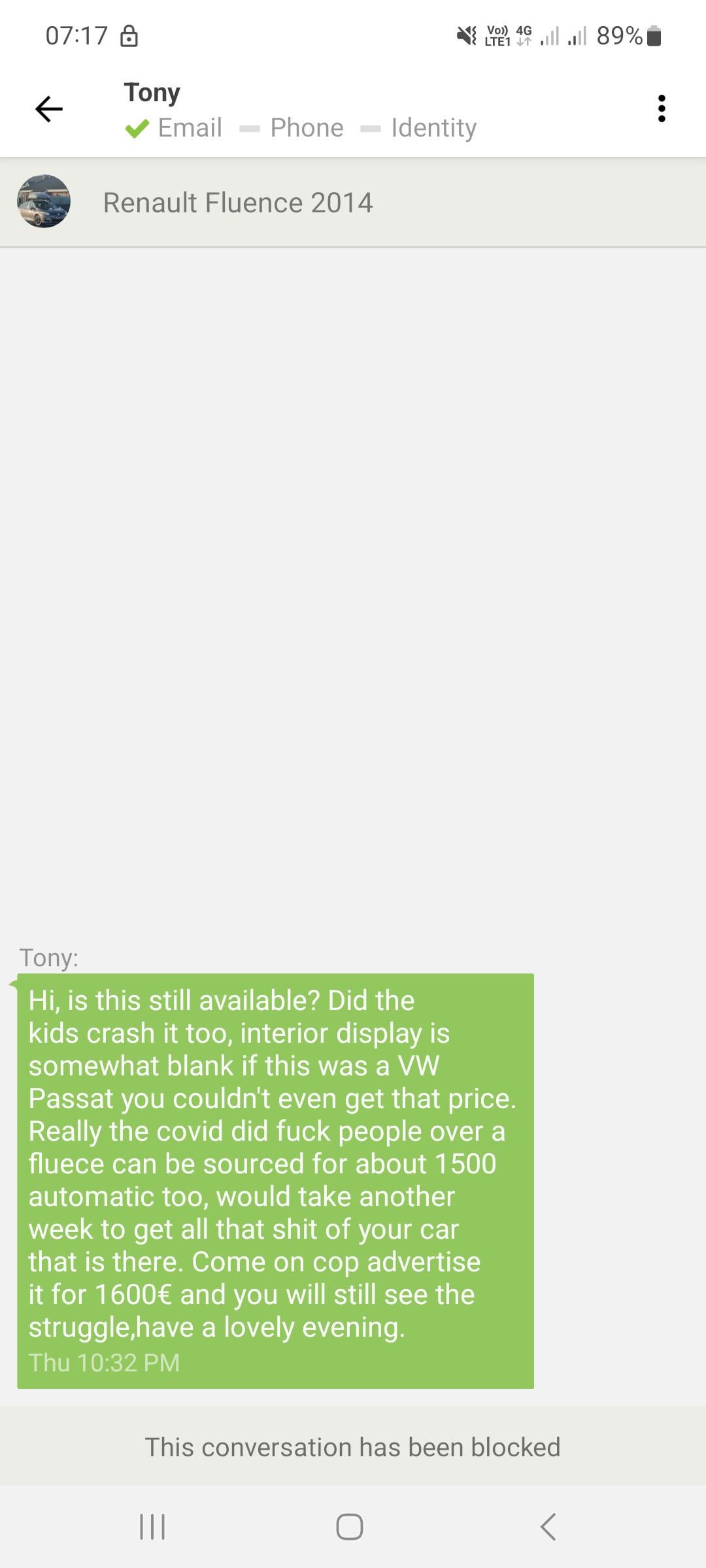Wie auch immer, mein Punkt ist, warum Menschen das Bedürfnis verspüren, so morsch und bösartig zu sein? Ich meine, er hat sich alle Mühe gegeben, ein Fake-Profil auf donedeal zu erstellen, uns zu beschimpfen und uns zu blockieren, sodass wir nicht einmal antworten konnten. Wann würden die Leute verstehen, dass niemand sie zwingt, etwas zu kaufen? Wenn ihnen etwas nicht gefällt, können sie einfach weiterscrollen, anstatt zu hassen.