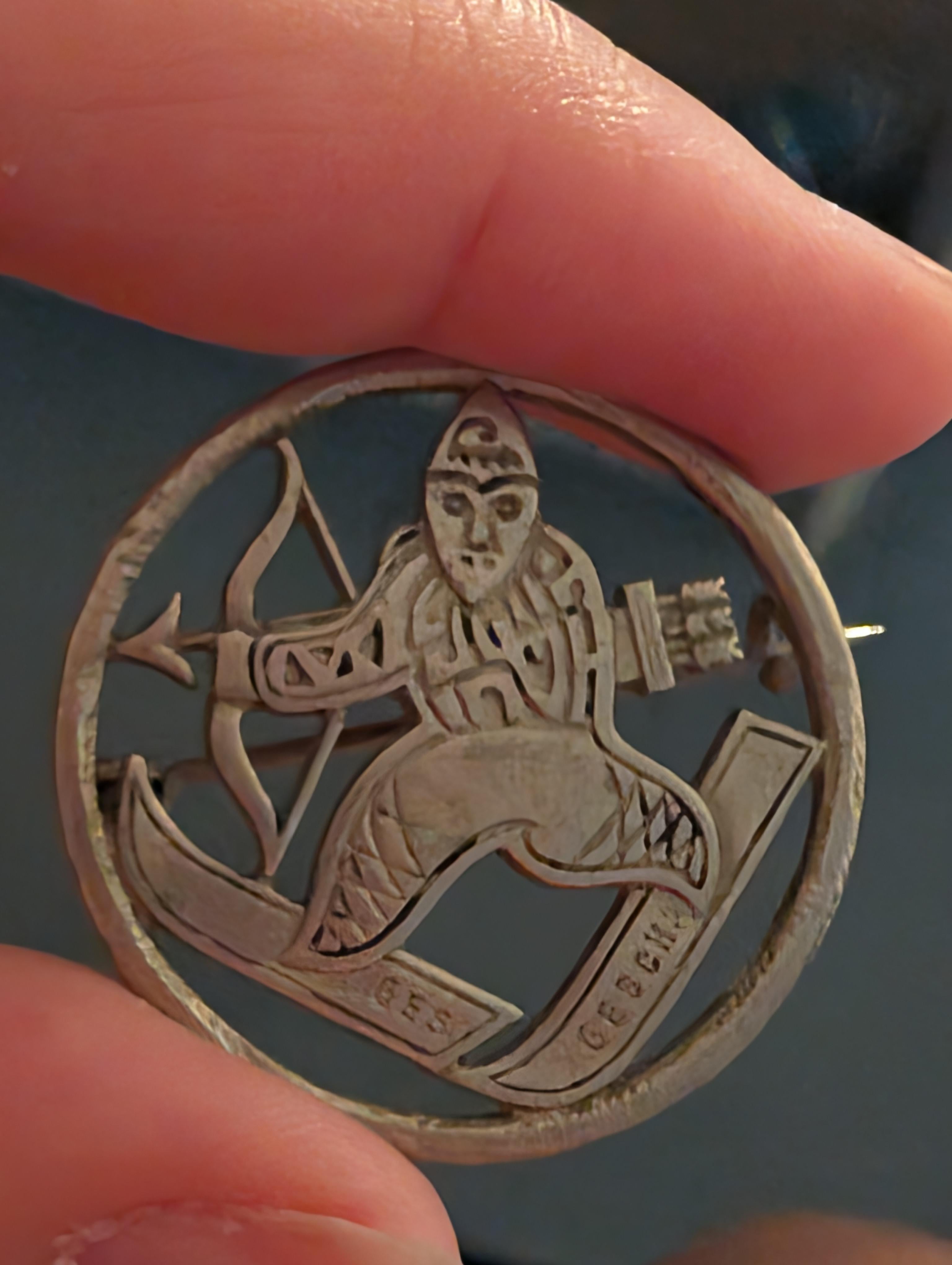 Ich habe es vor Jahren an einem Antiquitätenhändler in London gekauft. Ich blickte auf "Ges Gesch" das Internet sagt mir, dass es sich um die Kurzform der deutschen Phrase „Ges“ handelt. Gesch." ist eine Abkürzung für die deutsche Redensart "gesetzlich geschützt," was übersetzt bedeutet "gesetzlich geschützt" oder "eingetragen" auf Englisch. Es weist darauf hin, dass ein Produkt, Design oder eine Marke nach deutschem Recht offiziell registriert und rechtlich geschützt ist. Aber ich würde gerne mehr über diesen Pin erfahren. Ich freue mich über jede Hilfe oder Anregung, wie man herausfinden kann, woher dieser Pin stammt und was er darstellt