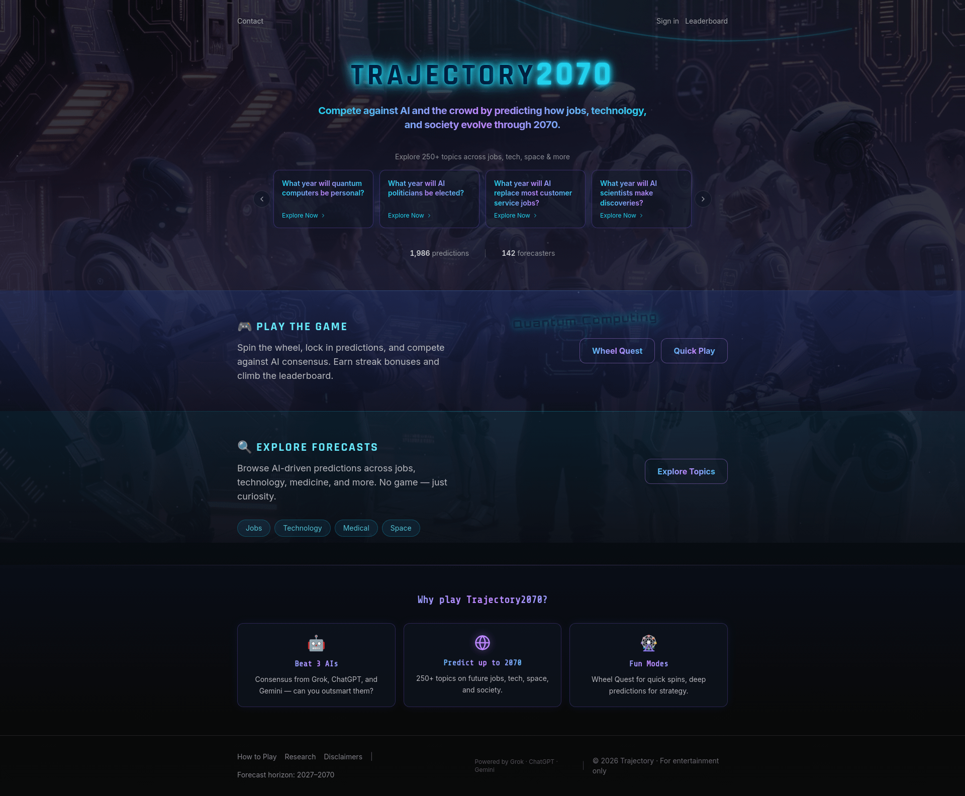 Ich habe das nicht alleine gemacht, ich habe jede Menge Input von Leuten bekommen, die Themen vorgeschlagen und ihre eigenen wilden Vermutungen geteilt haben. Dann habe ich eine Möglichkeit entwickelt, menschliche Vorhersagen zu verfolgen und sie mit den Annahmen der KI zu vergleichen. Von da an habe ich alles in ein superspaßiges Spiel verwandelt! Sie können einsteigen, Ihre eigenen Vorhersagen treffen oder eine schnelle „Rad“-Herausforderung drehen, bei der Sie gegen eine tickende Uhr zu Themen raten. Es gibt einen Spielmodus für Wettbewerbsstimmung oder einen Erkundungsmodus, wenn Sie einfach nur Prognosen abgeben möchten.