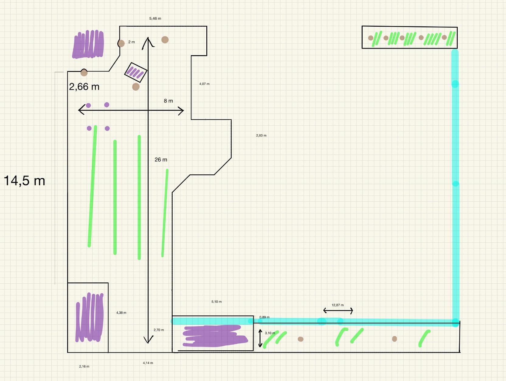Es gibt drei getrennte Rasenflächen. Die blaue Linie in der Skizze ist ein Steinweg, den der Roboter befahren kann und über den er zwischen den Flächen wechseln soll. Die grün markierten Bereiche sind Rasenflächen, lila markierte Bereiche sind Gebäude. Braune Punkte stellen Bäume dar, lila Punkte die Pfosten eines fest stehenden Pavillons. Die kleinste Rasenfläche ist nicht so wichtig, wäre aber gut, wenn sie trotzdem mitgemäht werden kann.