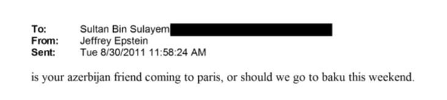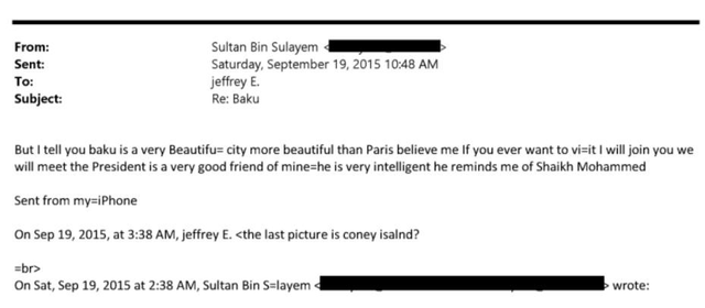 Offenbar ist Epstein nicht nach Baku gekommen. Denn 2015 schrieb Sultan erneut an Epstein: "Aber lassen Sie mich Ihnen sagen, dass Baku sehr schön ist. Es ist eine schönere Stadt als Paris, glauben Sie mir. Wenn Sie jemals dorthin wollen, werde ich mich Ihnen anschließen. Der Präsident ist ein sehr guter Freund von mir, er ist sehr intelligent, er erinnert mich an Scheich Mohammed."