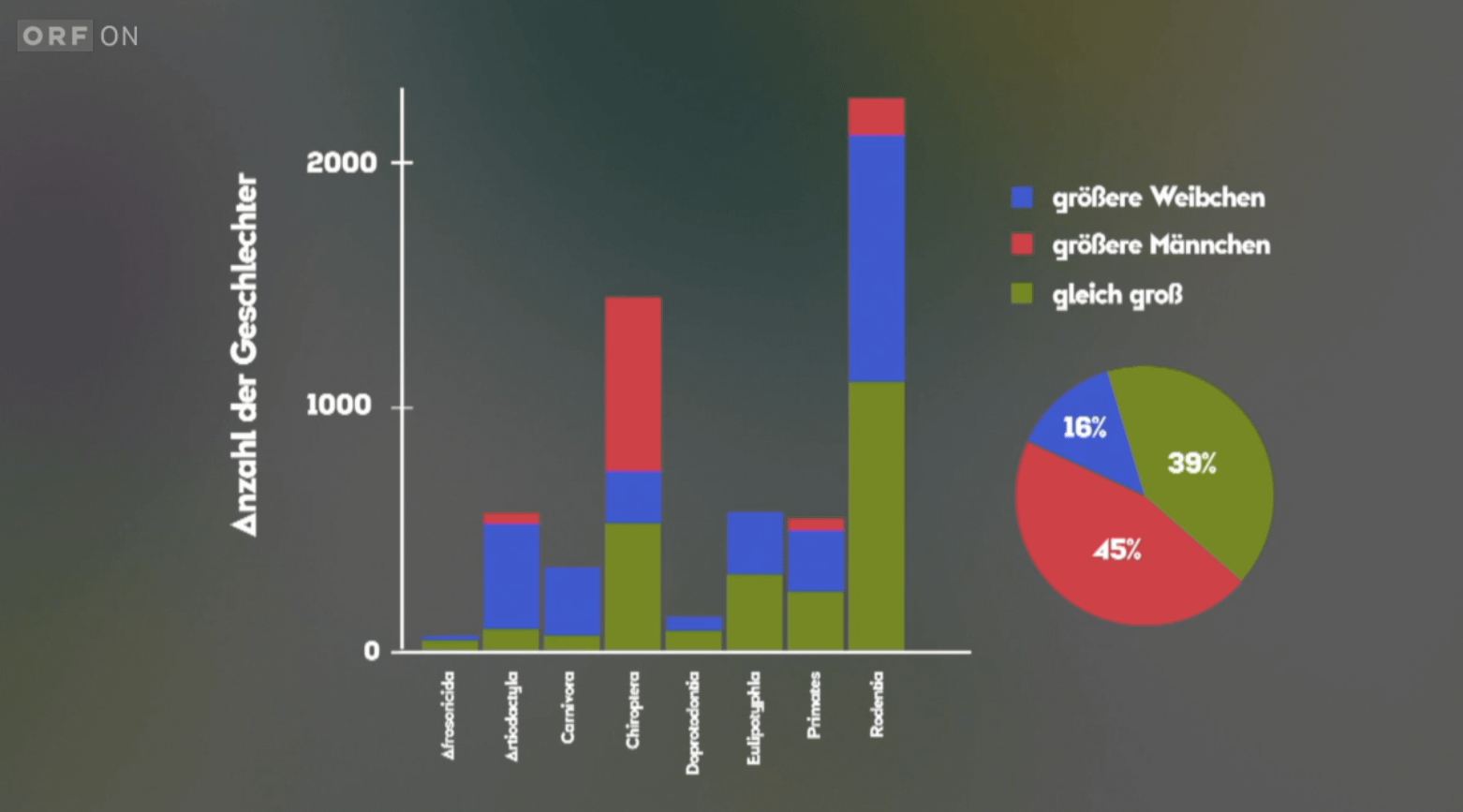 Habe letztens die aktuelle Folge von Fakt oder Fake gesehen. Bei einer Frage ging es darum ob man die Aussage "Männliche Säugetiere sind größer als die Weibchen" verallgemeinernd auf den Großteil der Arten anwenden könnte. (ab Minute 38:25).