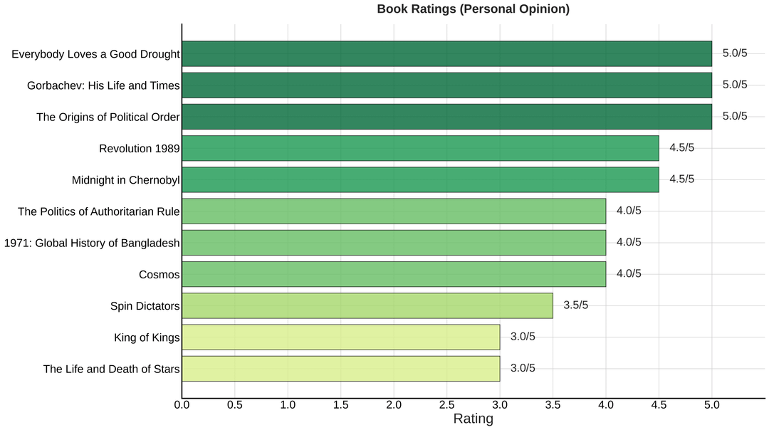- Buchbewertungen: Die Bewertung für jedes Buch hängt davon ab, wie sehr mir die Lektüre Spaß gemacht hat.