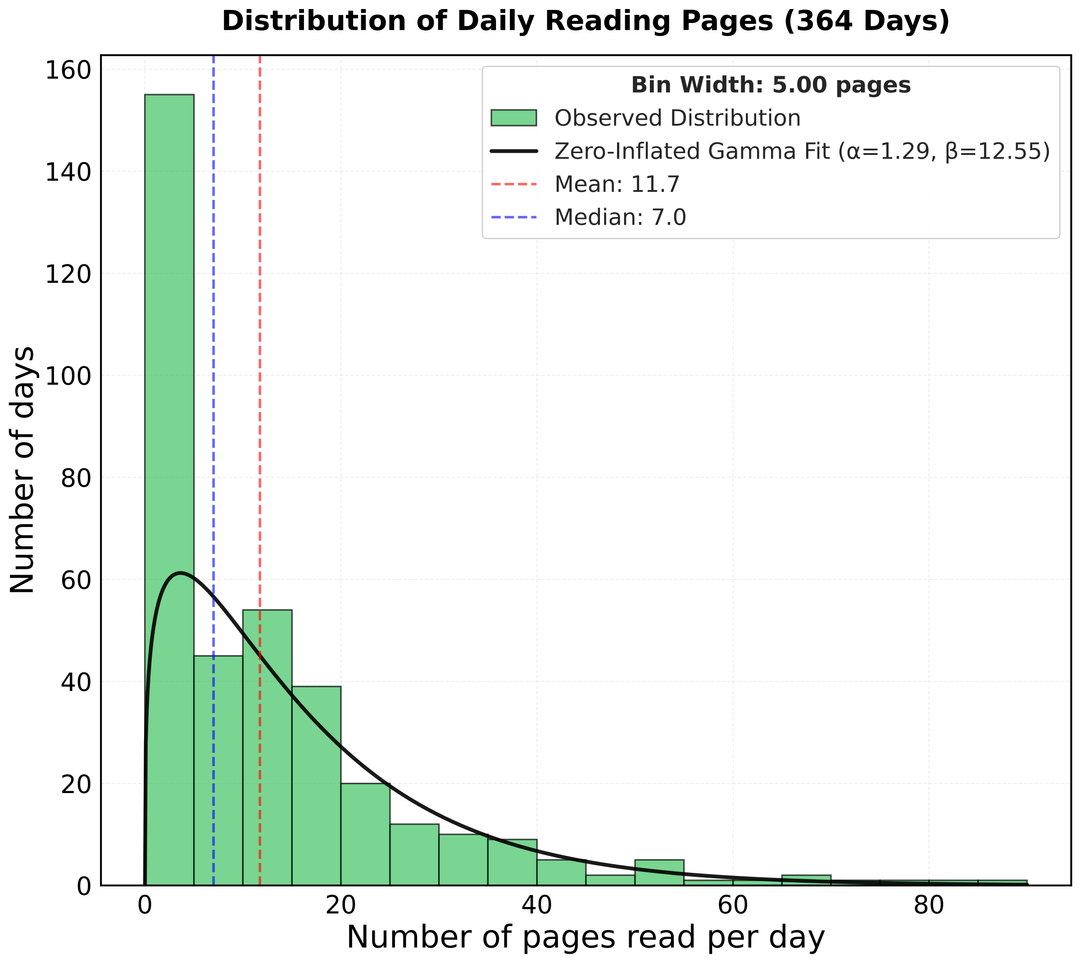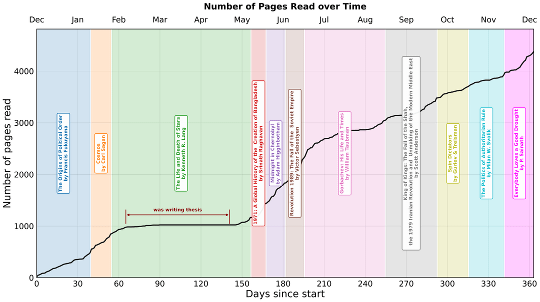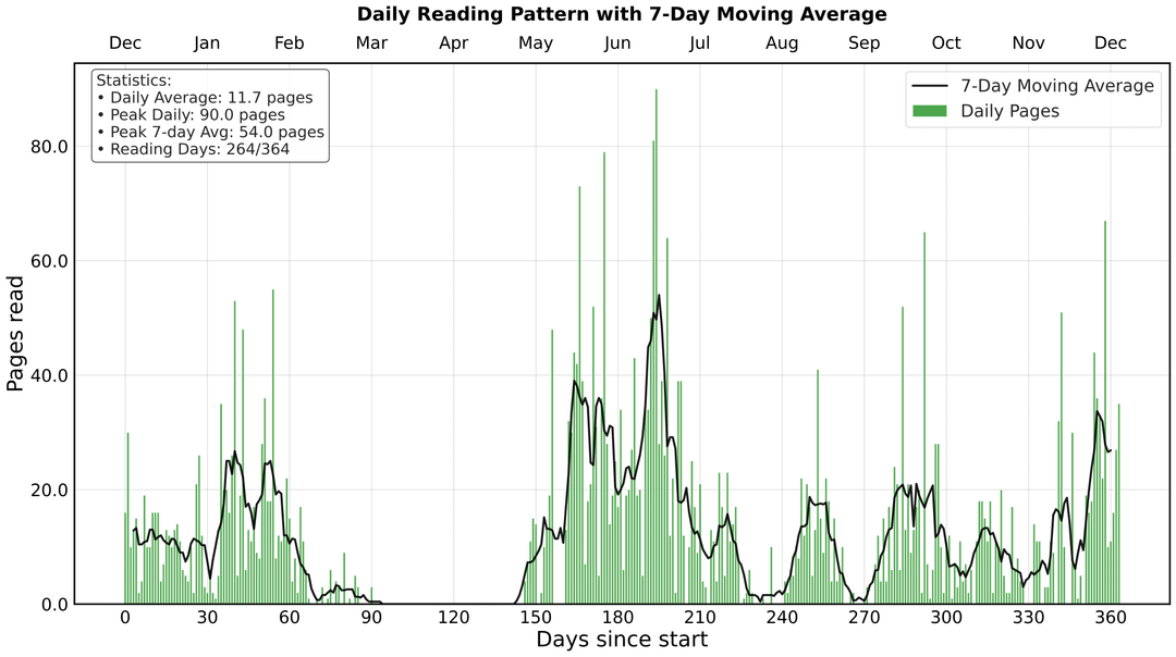 Ich habe jeden Tag mein Lesemuster für das vergangene Jahr notiert und dabei den Tag des Jahres, die Anzahl der täglich gelesenen Seiten und die Gesamtzahl der seit dem Starttag (27.12.2024) gelesenen Seiten im Auge behalten. Der letzte Tag war der 26.12.2025. Ich hatte mir zum Ziel gesetzt, 12 Bücher in einem Jahr zu lesen, aber am Ende fehlte mir ein einziges Buch.