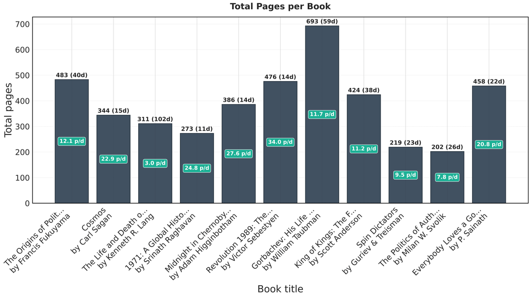 - Länge jedes Buches in Seiten: Zeigt die Anzahl der Tage an, die für die Fertigstellung des Buchs benötigt wurden (über der Leiste) und die durchschnittliche Geschwindigkeit für jedes Buch (innerhalb der Leiste in Seiten/Tag).