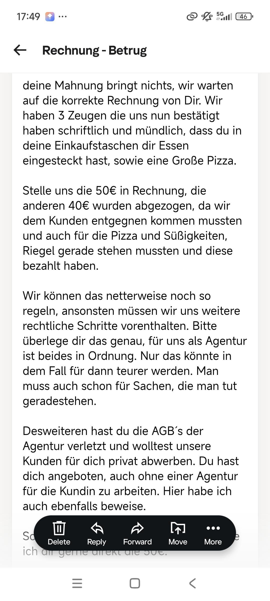 Beachten Sie, dass sich die Mahnung auf zwei Rechnungen für die Arbeit im Oktober bezieht, während sie sich offenbar auf die Arbeit im Januar konzentriert (wo die Vorwürfe aufkommen und sie 90 Euro erwähnt, weil ich an diesem Tag kürzere Stunden gearbeitet habe).