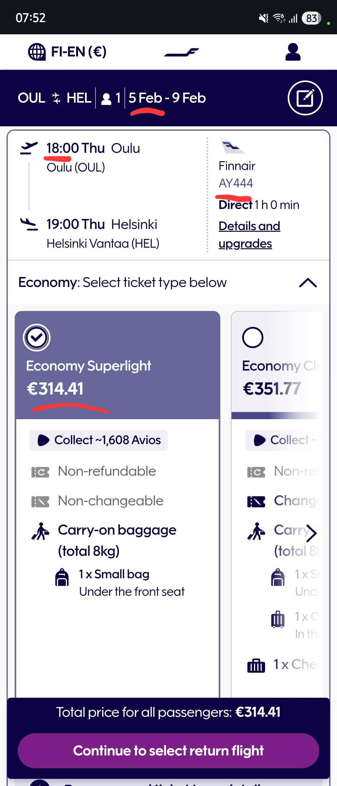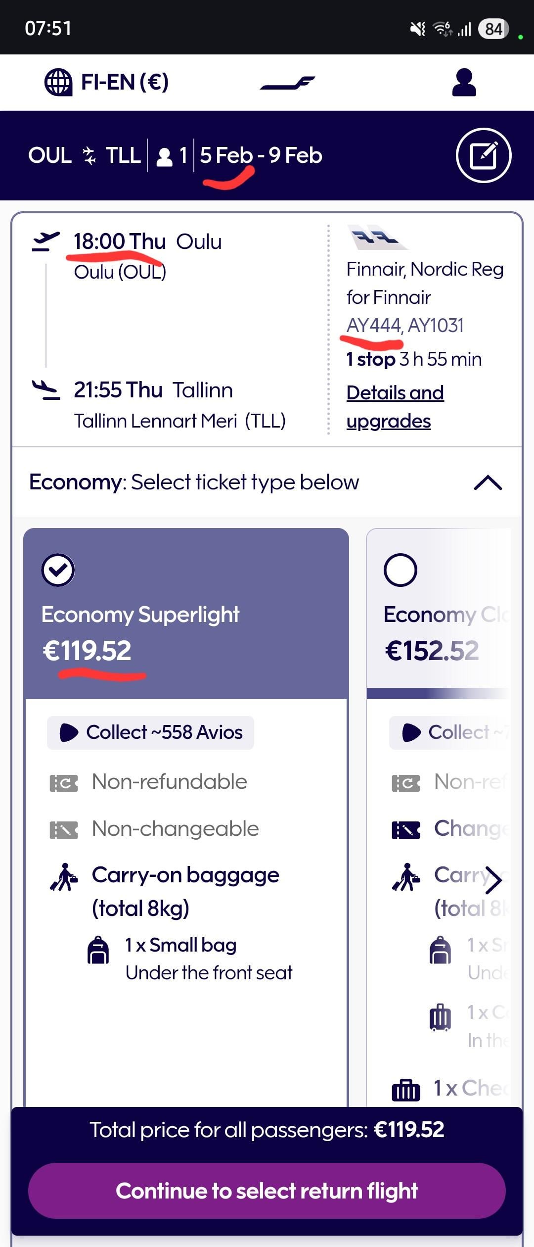Ich kenne und habe mehrmals erlebt, dass Finnair alles andere als ein guter Fluganbieter ist, mit hohen Preisen und ständigen Verspätungen. Aber ich habe gerade herausgefunden, dass ihre Preispolitik nicht nur überteuert, sondern fast schon Betrug ist. Der Flug von Oulu nach Helsinki am 5. Februar um 18 Uhr kostet ca. 300 EUR pro Strecke, und der Flug am selben Tag mit genau demselben Flugzeug zur genau gleichen Zeit von Oulu nach Tallinn über Helsinki kostet ca. 100 EUR pro Strecke. Was zum Teufel? Das ist lächerlich.