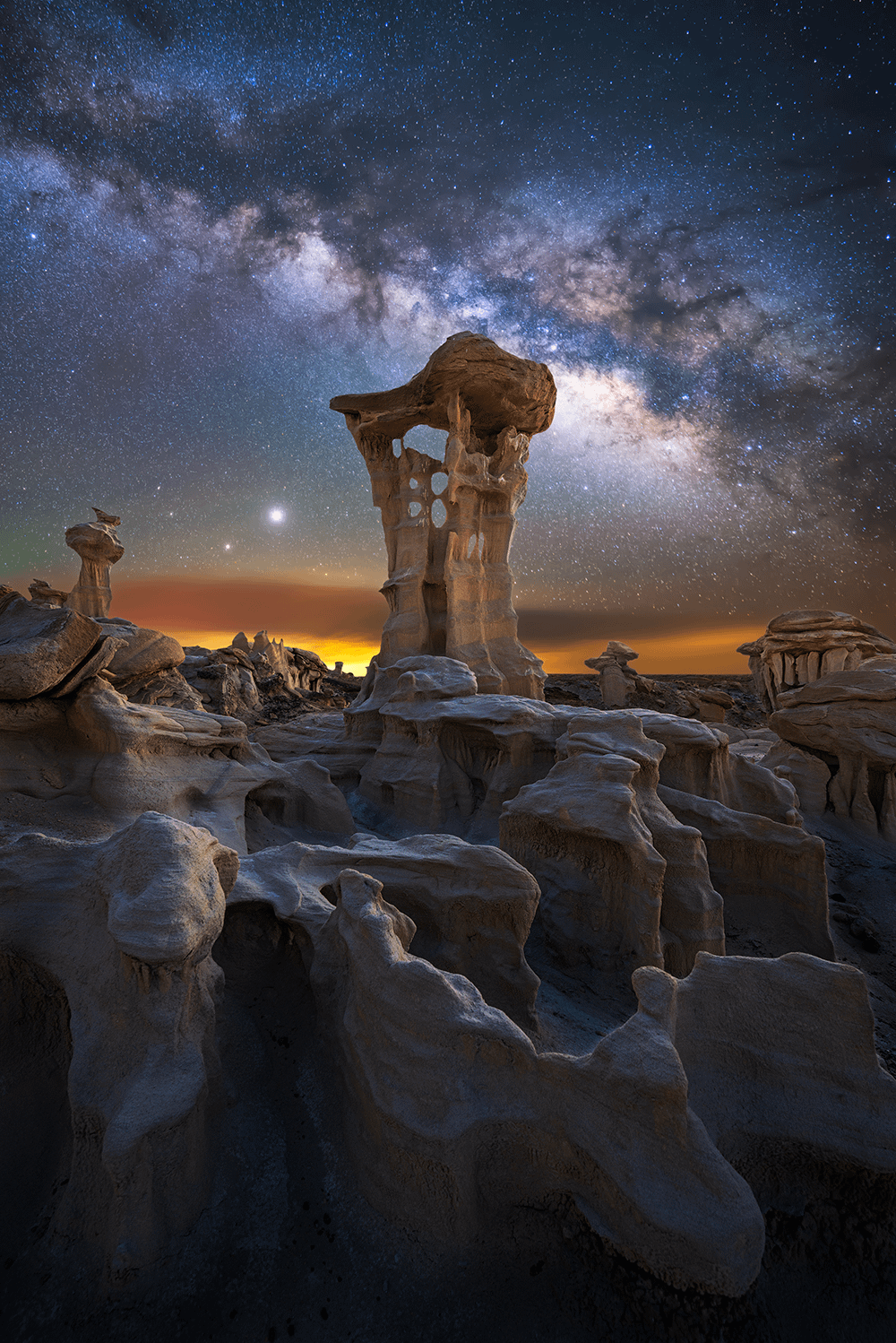 Die hellen Objekte links vom Hoodoo sind das Planetenduo Jupiter und Saturn, die sich in dieser Nacht ungewöhnlich nahe waren.