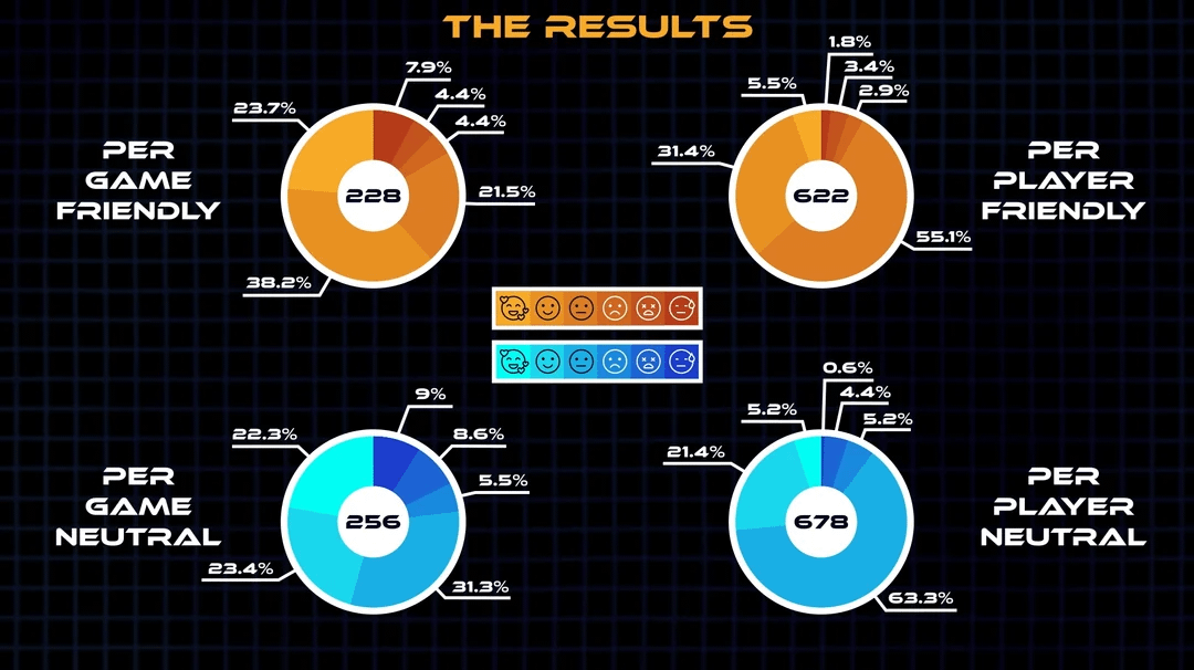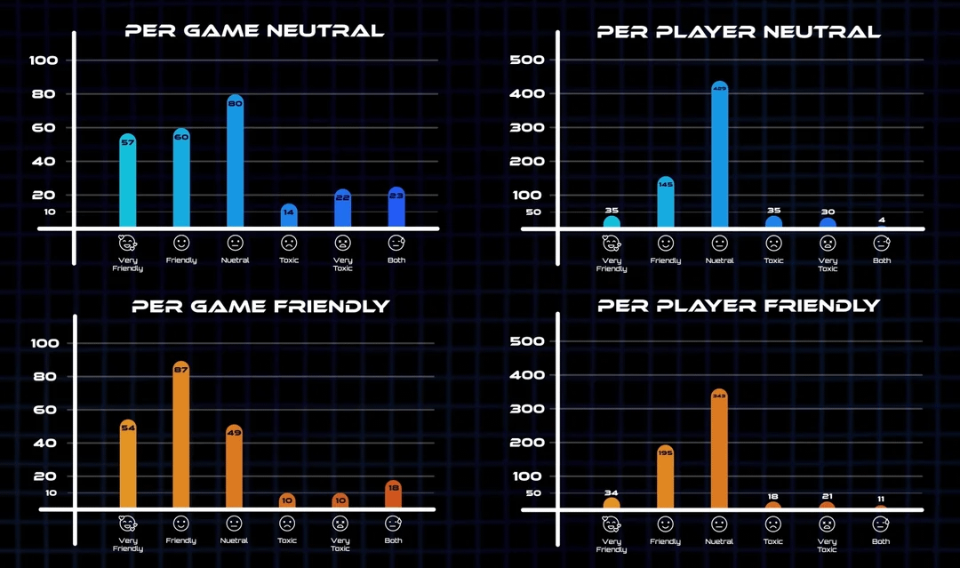 Each time a player acted in a way that could be considered inherently “Friendly” or “Toxic” that would be one ‘instance’ of that behavior happening. You only need one instance for the friendly or toxic categories, and at least one instance of each behavior type is required to be placed in the “both” category (even if a player may lean more towards one type of behavior). For the „Very Toxic“ or „Very Friendly“ categories, at least 4 separate instances of that behavior or one instance of a behavior that is already so extreme that it bypasses the “4 separate instances” requirement is needed. This is definitely the vaguest definition of the categories I’ve given, so I’ll try to give an approximate “bare minimum” requirement to be considered into the extreme categories off one instance. For the Very Toxic category, I would say that telling someone they’re terrible at the game or calling them trash would meet the criteria, and for the Very Friendly category, telling someone that they are excellent at the game would meet the criteria. It’s really that simple, if I consider an instance to be about on that level or greater, then it will be immediately categorized into the extreme categories without needing any other instances to qualify.