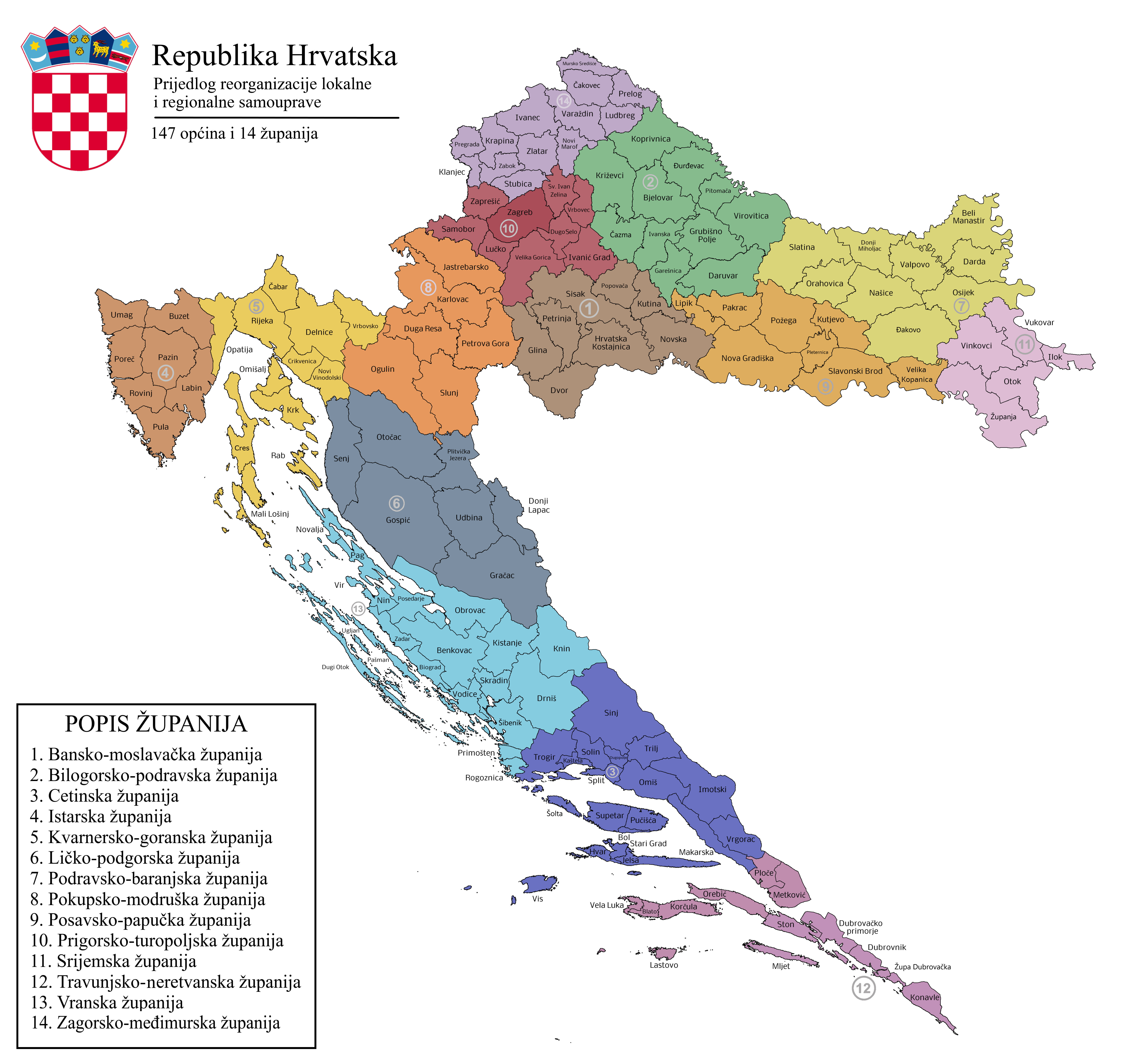 Virovitica, Daruvar i Novska su Slavonija, btw. Njih spojiš s ove tri Slavonske županije i napraviš jednu. Druga županije ti je Istra + Kvarner. Treća su ti ove tri Dalmatinske. Okrupniš ove preostale i dođeš na najviše 6 županija.