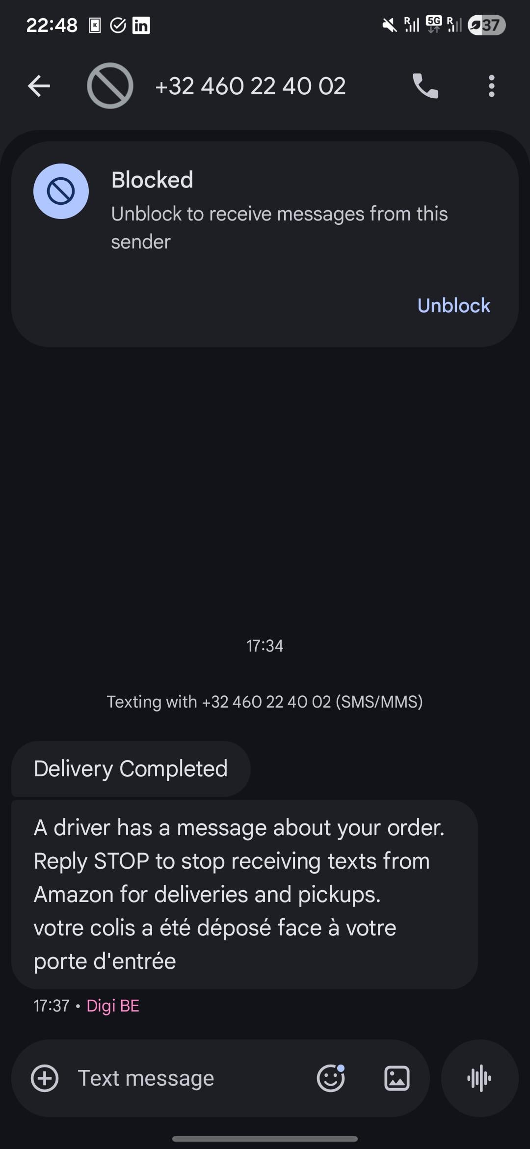 Zum Glück geriet ich nicht in Panik und kontaktierte den Amazon-Kundensupport. Sie sagten mir, dass diese Nachricht nicht von ihnen stammte und ich sie einfach ignorieren sollte. Sie schlagen vor, dass eine Möglichkeit, dies sicherzustellen, darin besteht, immer eine E-Mail zusammen mit der SMS zu senden, wenn eine Zustellung stattgefunden hat. SMS ohne E-Mail = keine echte Amazon-SMS.