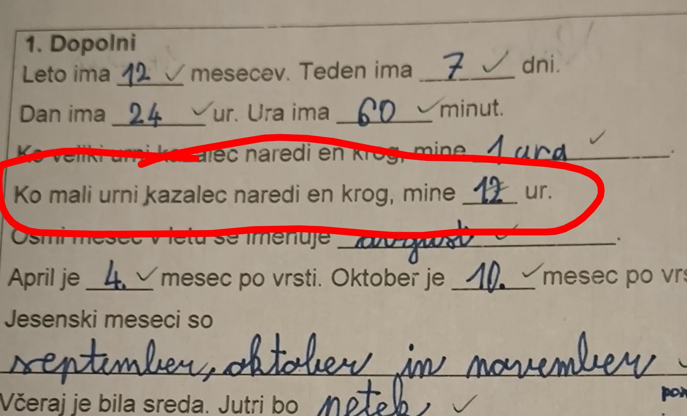 To je lapsus učiteljice, ki ga bo priznala. Vprašanje nad tem obkroženim nakazuje na minute – ena ura, spodnji na ure – 12 ur.