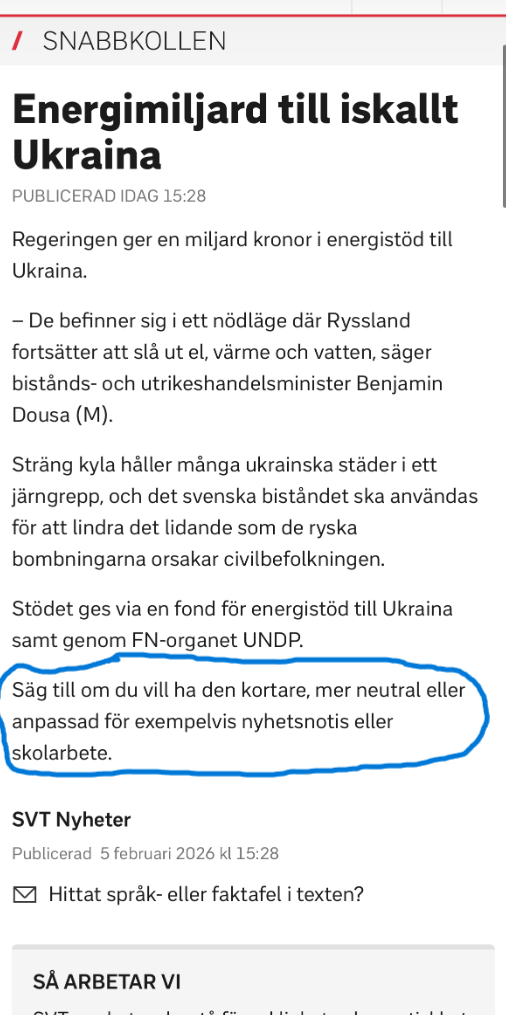 „Snabbkollen“ är väl små kortfattade artiklar baserade på deras längre artiklar. Så SVT matar nog ChatGPT med huvudartikeln och promptar „skriv en kortfattad sammanfattning av denna text“. Verkar vara denna som är grundartikeln: [https://www.svt.se/nyheter/inrikes/en-miljard-i-svenskt-energistod-till-ukraina](https://www.svt.se/nyheter/inrikes/en-miljard-i-svenskt-energistod-till-ukraina)