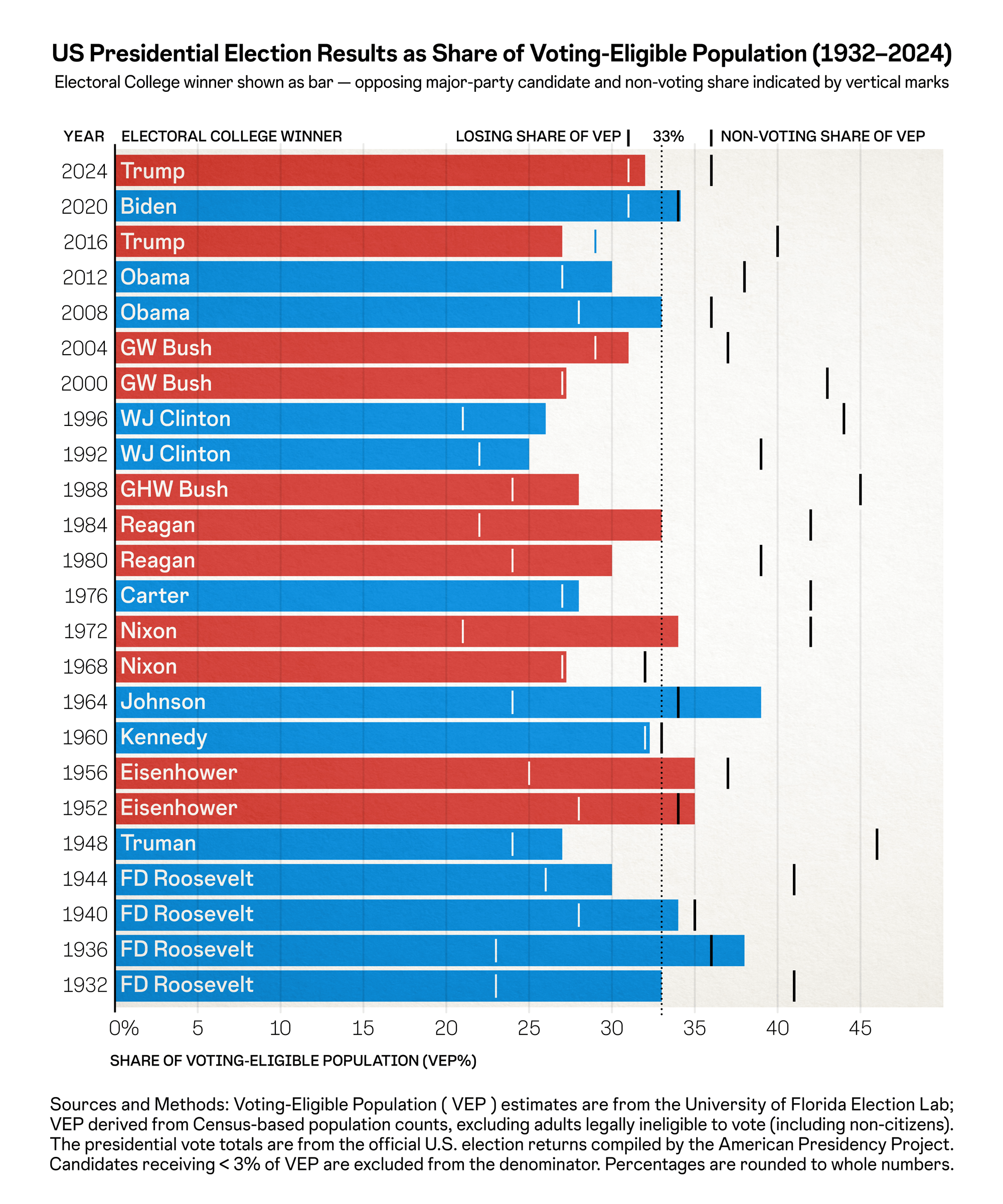 This chart shows U.S. presidential election outcomes since 1932 in terms of shares of the Voting-Eligible Population (VEP) rather than shares of ballots cast. For each election, the Electoral College winner’s share of VEP is shown as a bar, while the opposing major-party candidate and the share of eligible citizens who did not vote are shown as reference markers. By anchoring results to eligibility instead of turnout alone, the figure highlights how election outcomes have consistently depended as much on non-participation as on vote choice, and it places recent elections within a long historical range of participation levels rather than treating high raw vote totals as exceptional.