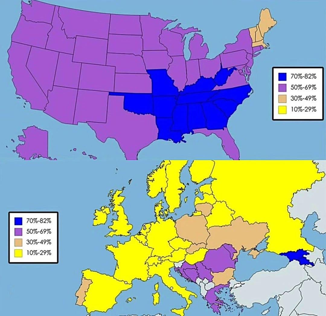 How does it only peak at 82% in the South? I thought it was the Bible Belt? And you still have a huge chunk of people who don’t believe in God? Florida is especially surprising