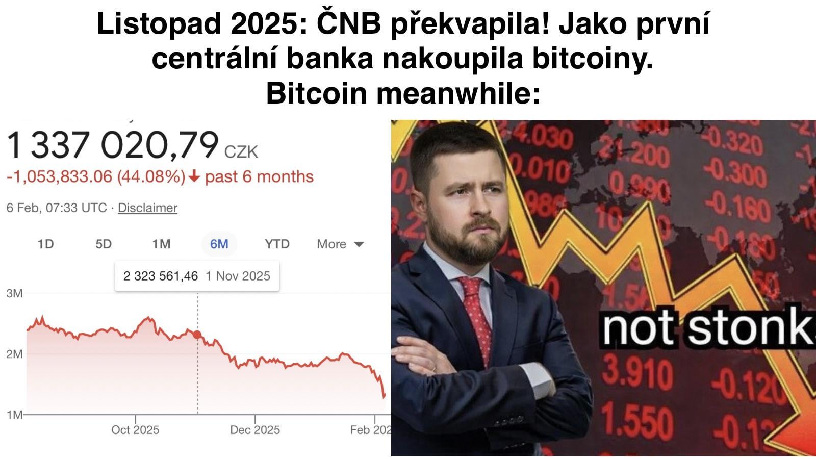 Doufám, že až bude Bitcoin zase nad nákupní cenou ČNB, tak uděláš příspěvek, že měla ČNB pravdu. 🙃 A to Michla fakt rád nemám.